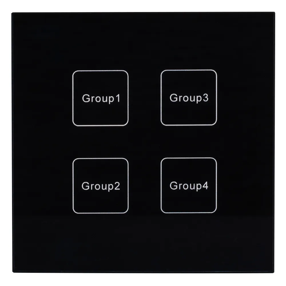 Встраиваемая сенсорная панель с выходом DALI. 4 кнопки, 4 группы. Каждой кнопкой выполняется включение, выключение и диммирование по соответствующей ей группе. Программир-е групп с помощью мастер-контроллера. Установка стартового номера группы выполняется переключателями на корпусе. Питание от шины DALI (4 мА).