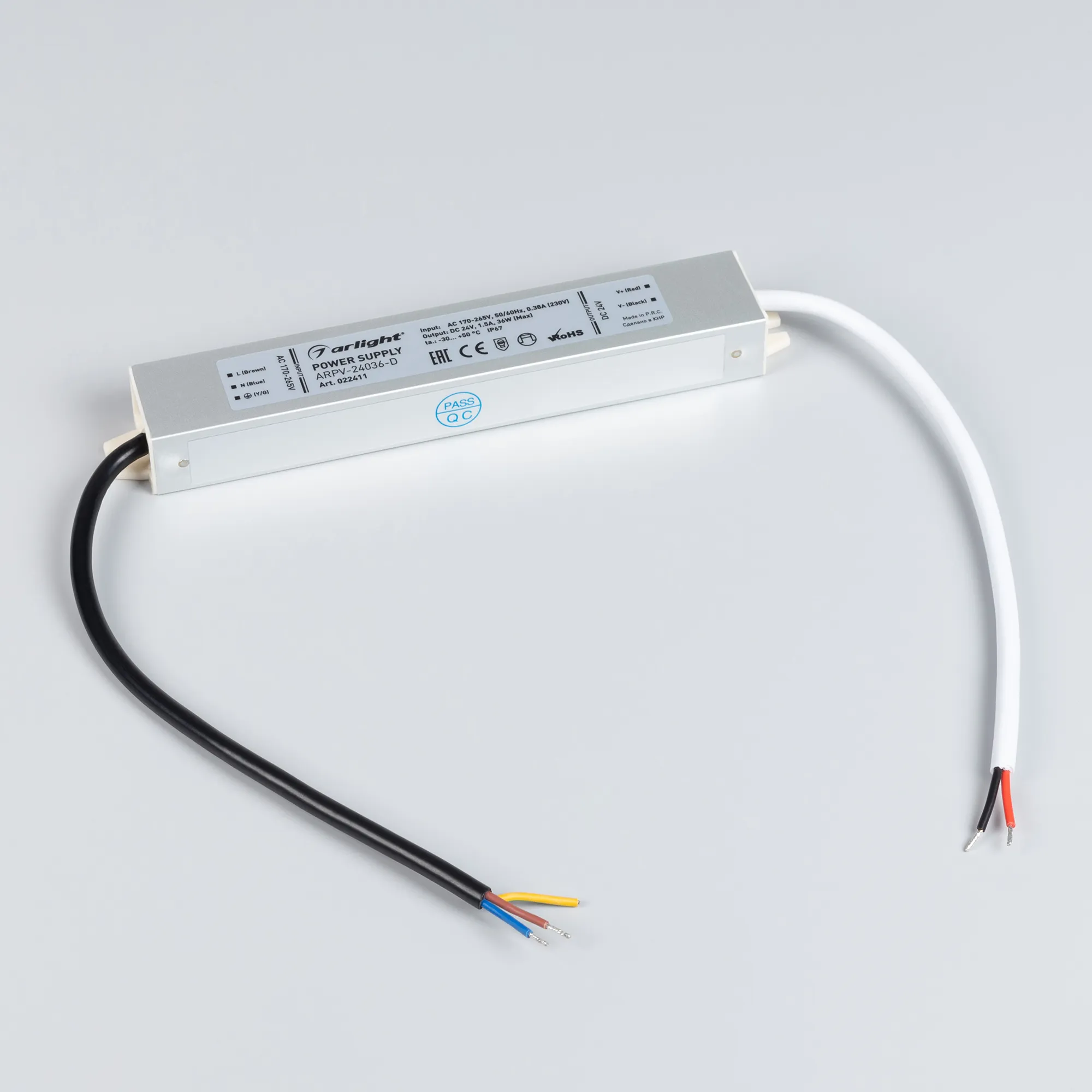 Источник напряжения с гальванической развязкой для светодиодных изделий. Входное напряжение 170-265 VAC. Выходные параметры: 24 В, 1,5 А, 36 Вт. Встроенный PFC >0,5. Герметичный алюминиевый корпус IP 67. Рабочая температура -30…+50C⁰. Габаритные размеры длина 182 мм, ширина 30 мм, высота 20 мм. Гарантийный срок 3 года.