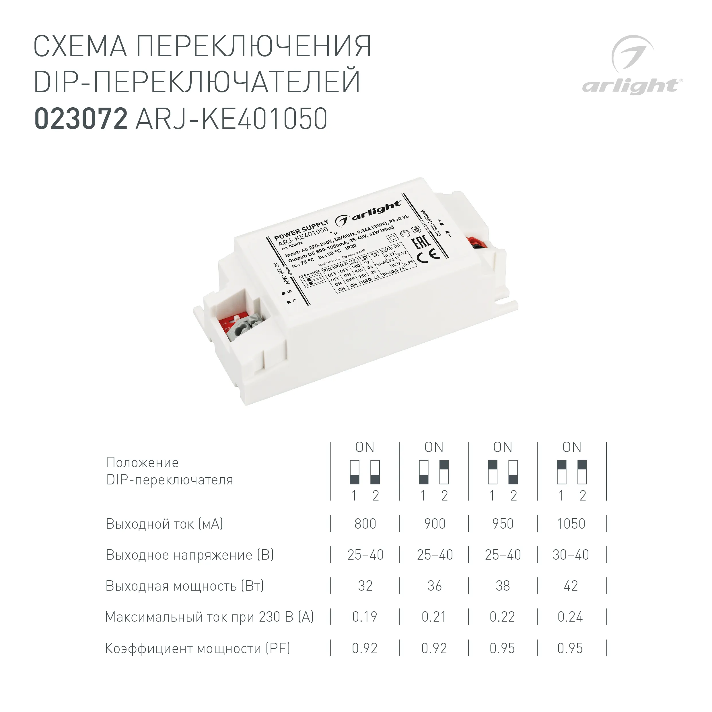 Блок питания ARJ-KE401050 (42W, 800-1050mA, PFC) (Arlight, IP20 Пластик, 5 лет)