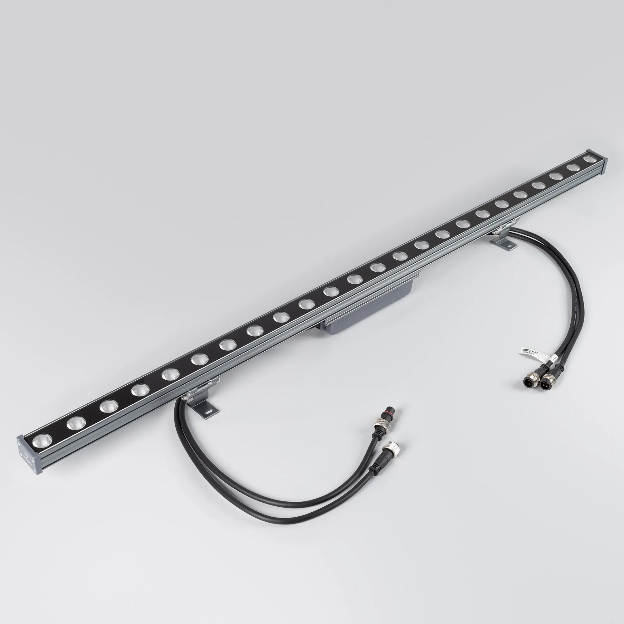 Ультратонкий линейный светодиодный прожектор. Мощность 24W, напряжение питания DC 24V. Светодиоды EPILED 24 штуки. Цвет светодиодов RGB, управление по протоколу DMX512, угол рассеивания 30°. Корпус: алюминиевый сплав и армированное стекло. Цвет корпуса серый, степень влагозащиты IP65. Габариты 1000x40x30мм.