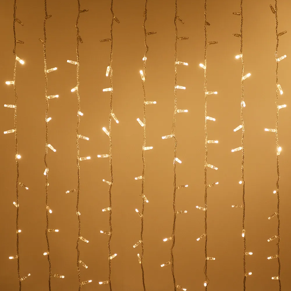 Светодиодный занавес Classic. Размер 2000x9000 мм (длина 2000 мм, высота 9000 мм). 20 ниспадающих нитей длиной 9000 мм. Цвет светодиодов ТЕПЛЫЙ БЕЛЫЙ (3000 К), динамический эффект "водопад". 2200 светодиодов размером 7 мм с резким световым рисунком (прозрачная вогнутая линза). Провод прозрачный, ПВХ. Питание 230 В, Мощность 180 Вт, защита IP65, применение в помещении и на улице под навесом. Аксессуары для подключения в комплекте.
