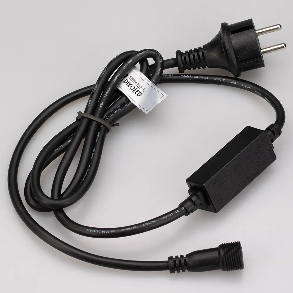 Шнур питания для светодиодных гирлянд с эффектом мерцания. Материал оболочки ПВХ. Цвет провода чёрный. В комплект входит: шнур питания с вилкой европейского стандарта (IP44), 2pin разъём подключения к гирлянде, выпрямитель AC/DC (1.6A). Длина провода 1.5 метра.