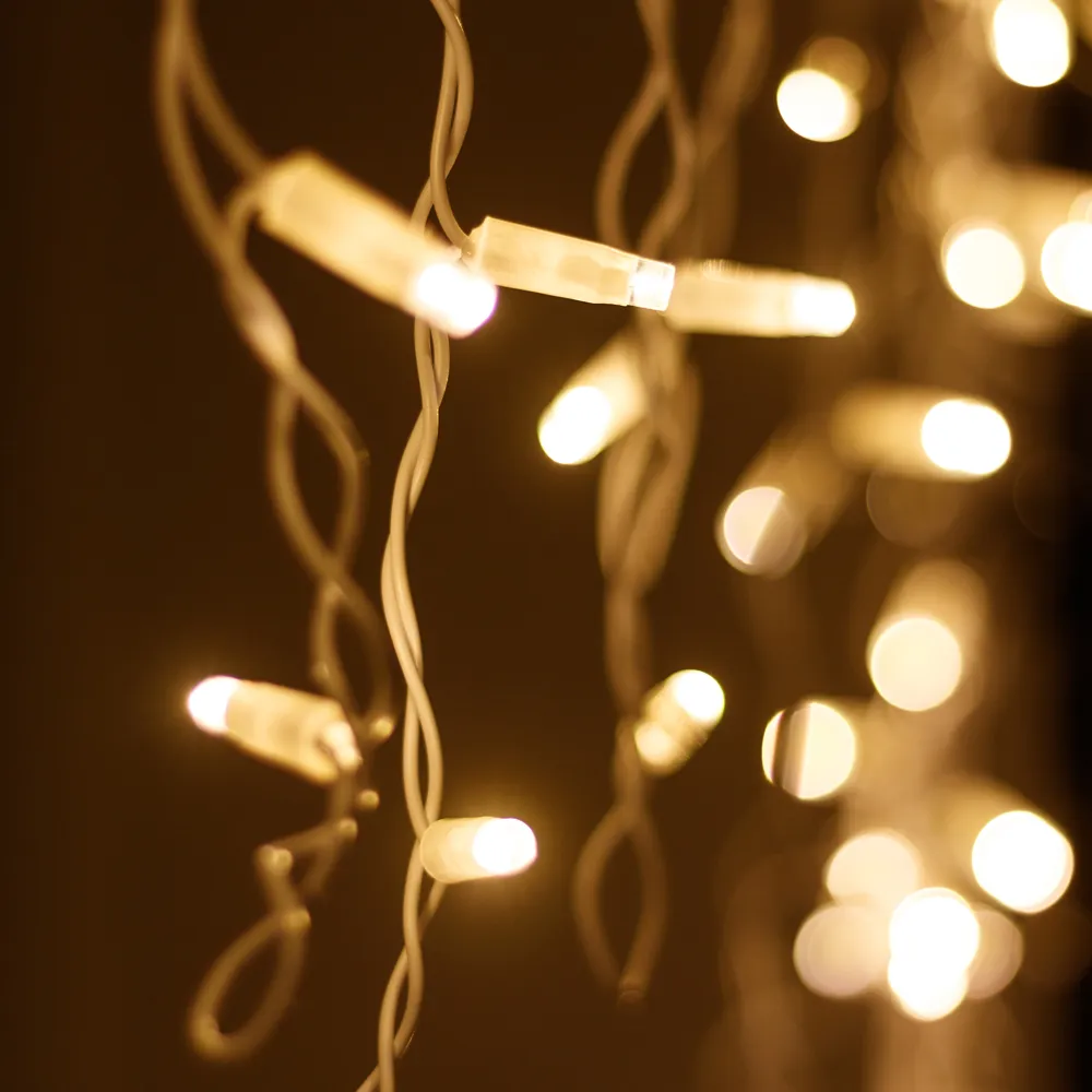 Светодиодная бахрома Classic. Размер 2400x600 мм (длина 2400 мм, по длине 24 нити высотой 200/600 мм). Количество светодиодов 88 шт размером 7 мм. Цвет свечения ТЕПЛЫЙ БЕЛЫЙ (3000 К), эффект постоянного свечения с резким световым рисунком (прозрачная вогнутая линза). Провод белый, ПВХ. Питание 230 В, Мощность 6 Вт, защита IP65, применение на улице под навесом. Аксессуары для подключения приобретаются отдельно.