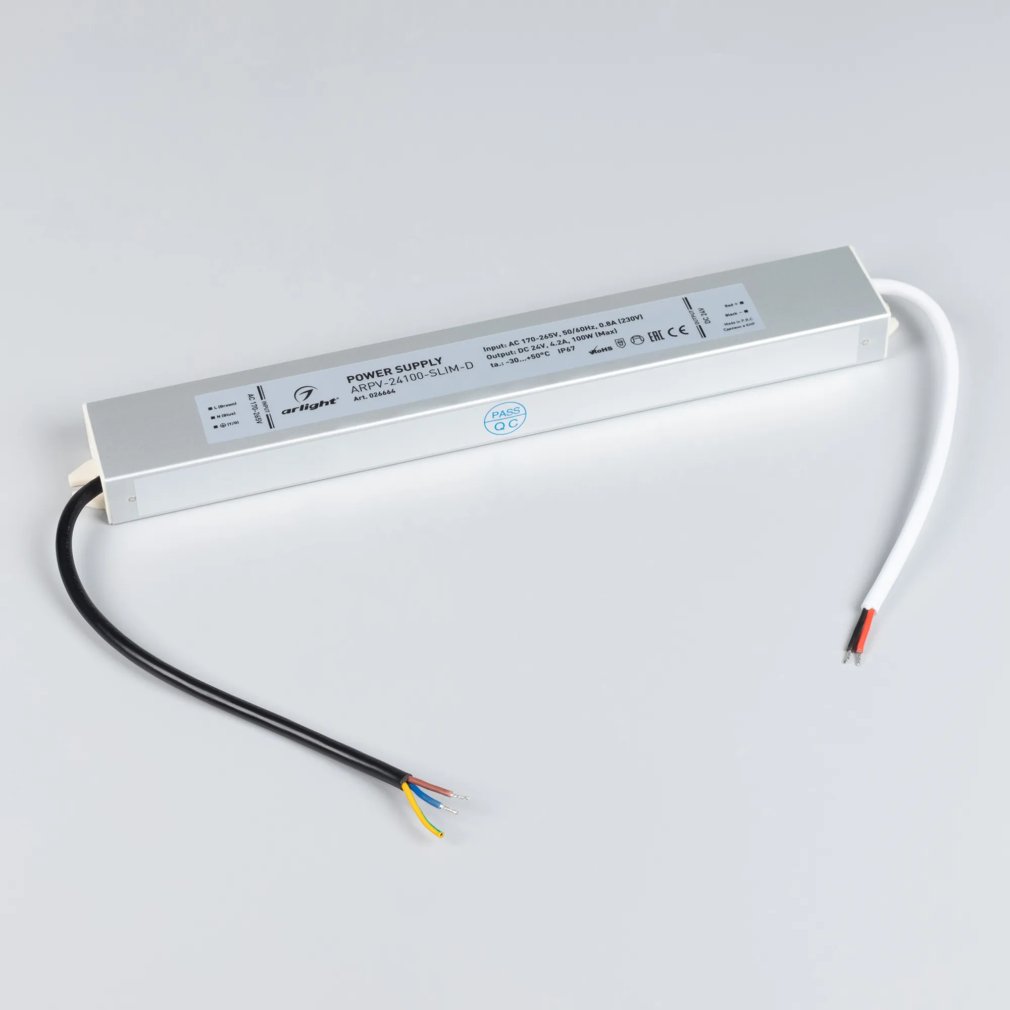 Источник напряжения с гальванической развязкой для светодиодных изделий. Входное напряжение 170-265 VAC. Выходные параметры: 24 В, 4.2 А, 100 Вт. Встроенный PFC >0.5. Герметичный алюминиевый корпус IP 67. Рабочая температура -30…+50C⁰. Габаритные размеры длина 303 мм, ширина 40 мм, высота 22 мм. Гарантийный срок 3 года.
