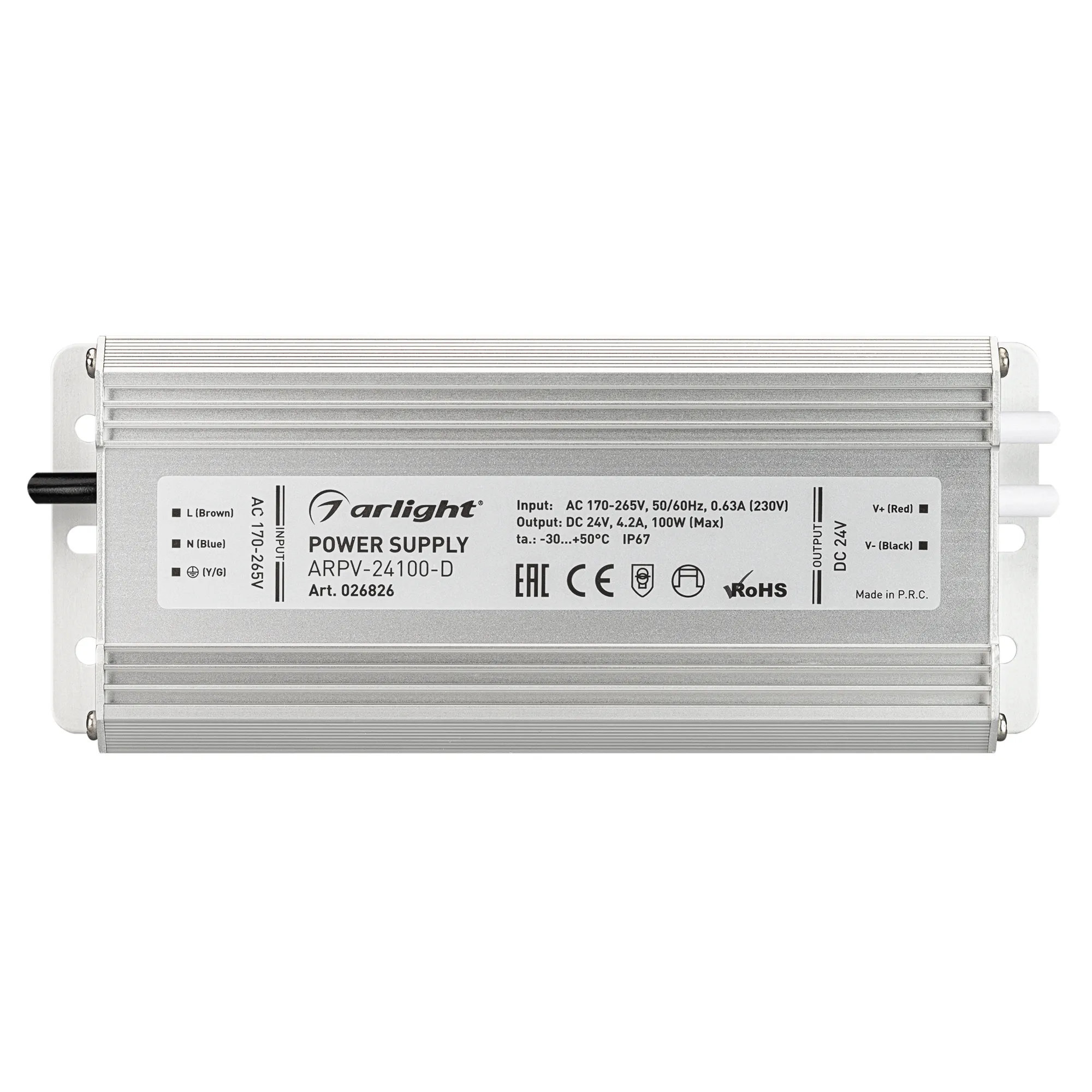 Источник напряжения с гальванической развязкой для светодиодных изделий. Входное напряжение 170-265 VAC. Выходные параметры: 24 В, 4.2 А, 100 Вт. Встроенный PFC >0.5. Герметичный алюминиевый корпус IP 67. Рабочая температура -30…+50C⁰. Габаритные размеры длина 178 мм, ширина 71 мм, высота 46 мм. Гарантийный срок 3 года.
