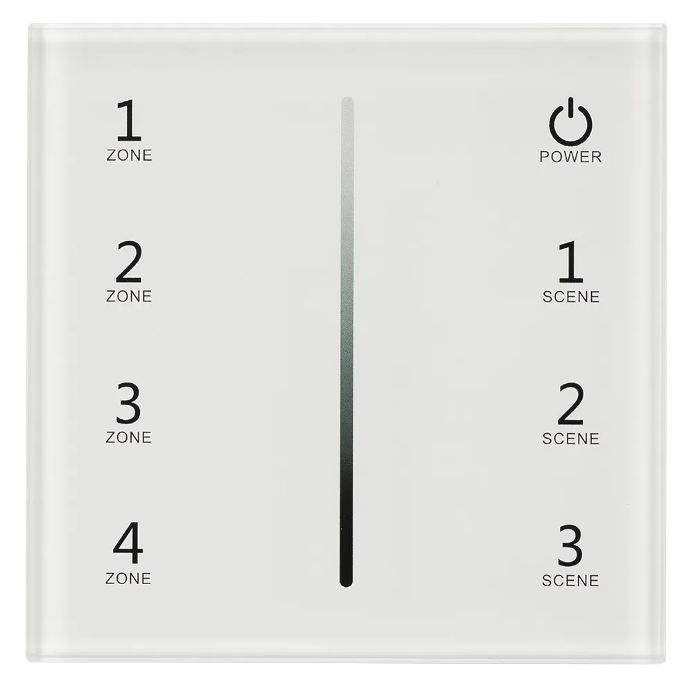 Встраиваемая сенсорная стеклянная панель 2.4 ГГц, цвет белый. Для управления яркостью с помощью сенсорной полосы. Питание/рабочее напряжение AC 100-240V, 4 зоны управления, память 4 сцен. Функция управления DMX512 устройствами. Габариты 86х86х36 мм. Панель совместима с диммерами и пультами серии SMART.