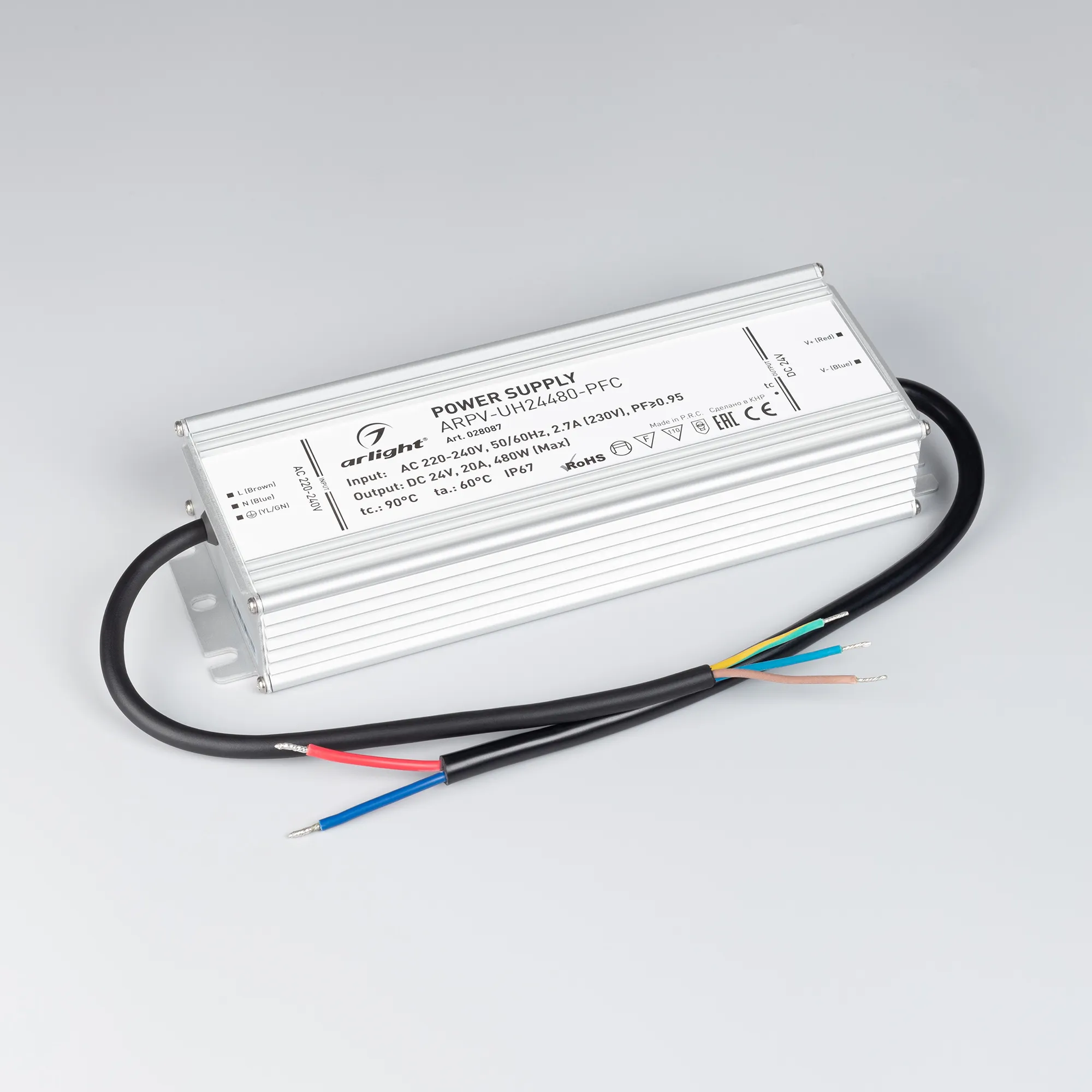 Источник напряжения с гальванической развязкой для светодиодных изделий. Входное напряжение 220-240 VAC. Выходные параметры: 24 В, 20 А, 480 Вт. Встроенный PFC >0,95. Герметичный алюминиевый корпус IP 67. Рабочая температура -40…+70C⁰. Габаритные размеры длина 251 мм, ширина 90 мм, высота 41.5 мм. Гарантийный срок 7 лет.