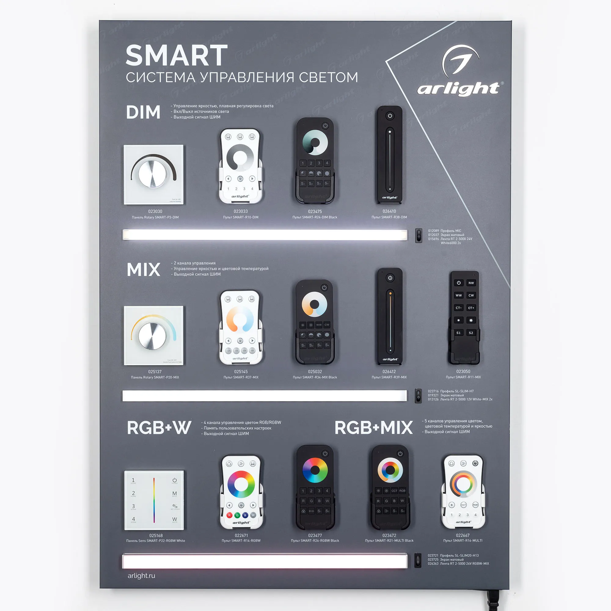 Наши специалисты знают все о продукции Arlight и с радостью помогут Вам выбрать комплектующие к товару "Стенд Системы Управления SMART 830x600mm (DB 3мм, пленка, лого) (Arlight, -)", или другие товары из раздела "Управление светом".