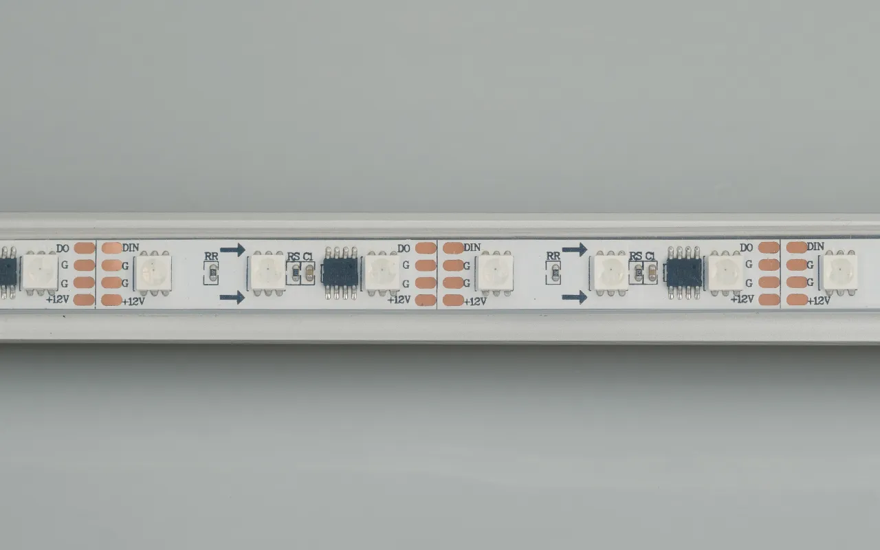 Поставка под заказ от 495 м. Гибкая герметичная лента Бегущие огни в силиконовой трубке (IP66), со СКОТЧЕМ 3M на обратной стороне, с драйвером 1804, встроенный в ленту контроллер с циклическим автозапуском 300 программ (Auto mode) и подкл-ем внеш. контроллера. Длина 5м, 300шт LED RGB 5060, 20 pixel/m (1 pixel = 3 LED). Питание 12V, ном. мощн. 8 Вт/м, макс. мощн-ть 13,2 Вт/м (статический белый цвет). Ширина 12 мм. Герметичные КРУГЛЫЕ коннекторы.