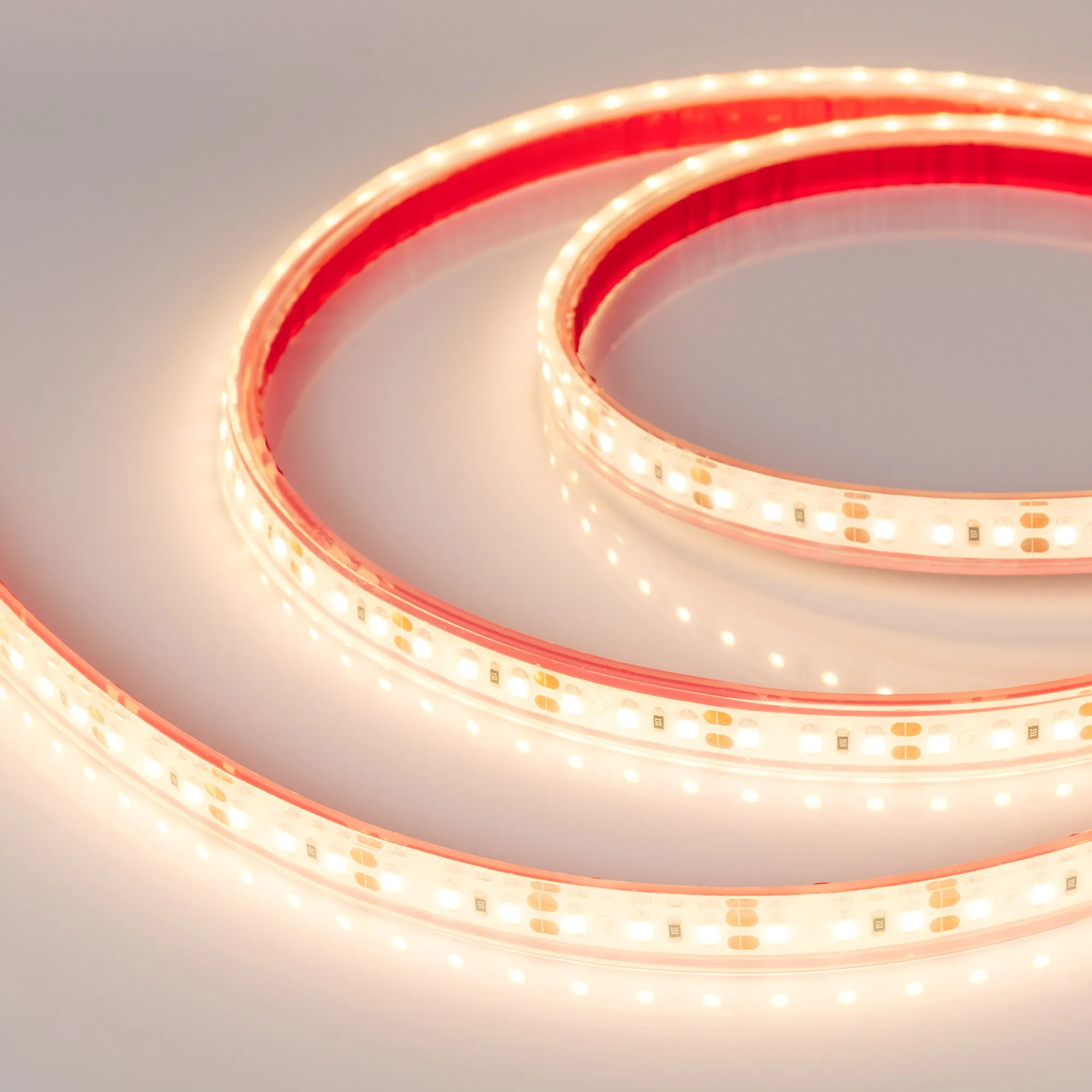 Гибкая лента LUX, герметичная IP67 (в силиконовой трубке с герметиком), светодиоды smd 3528, 120шт/м (600шт на 5м), красный скотч 3М. Цвет ТЁПЛЫЙ 2750-3250K. Питание 12V, мощность 9.6 Вт/м (48 Вт на 5м), угол 120°, цветопередача CRI>85. Размеры 5000х11x5мм. Мин.отрезок 25мм, 3шт светодиода. Пакет 5м. Цена за 1м.