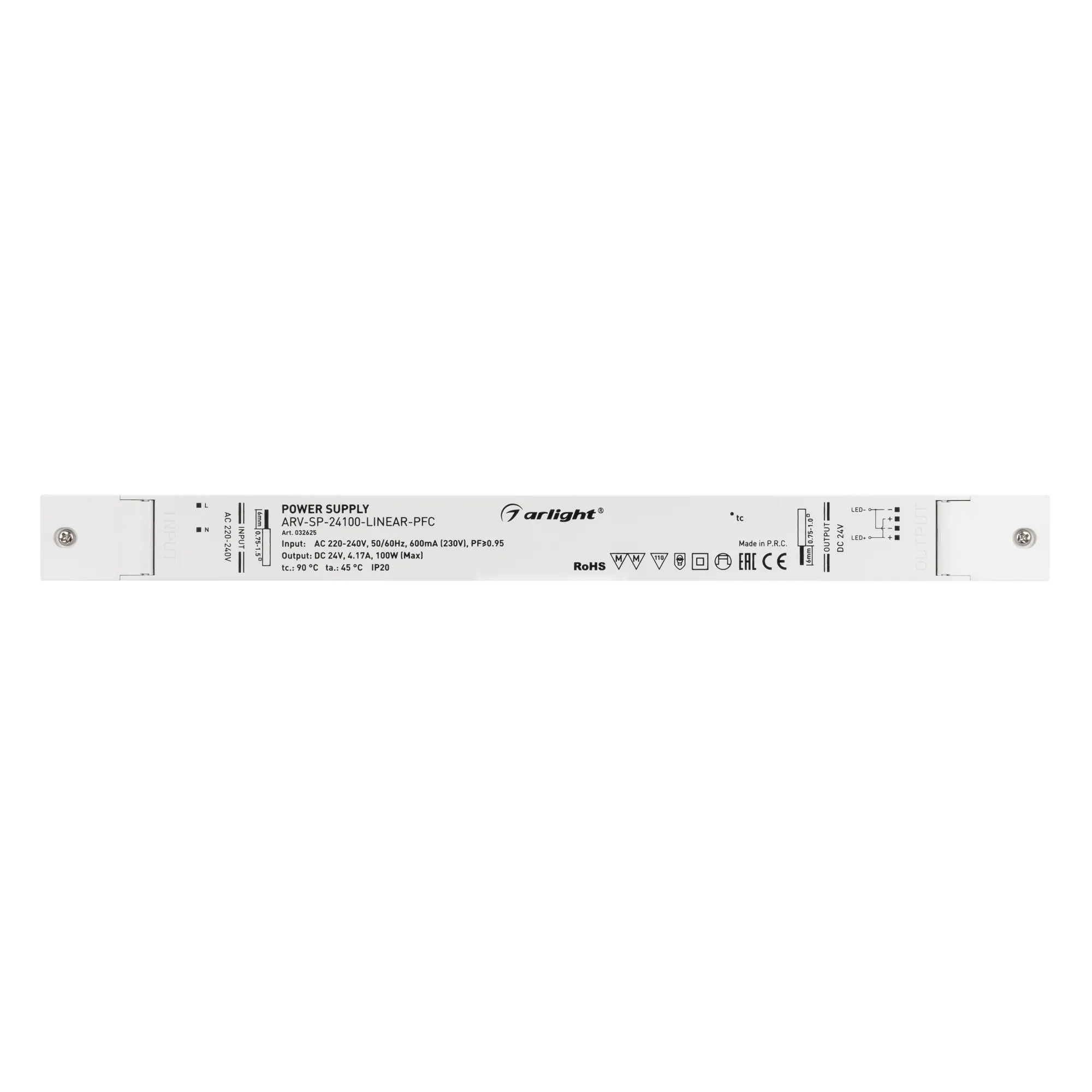 Источник напряжения с гальванической развязкой для светодиодных изделий. Входное напряжение 220-240 VAC. Выходные параметры: 24 В, 4.17 А, 100 Вт. Встроенный PFC >0.95. Тонкий пластиковый корпус IP 20. Габаритные размеры длина 350 мм, ширина 30 мм, высота 18 мм. Гарантийный срок 5 лет.