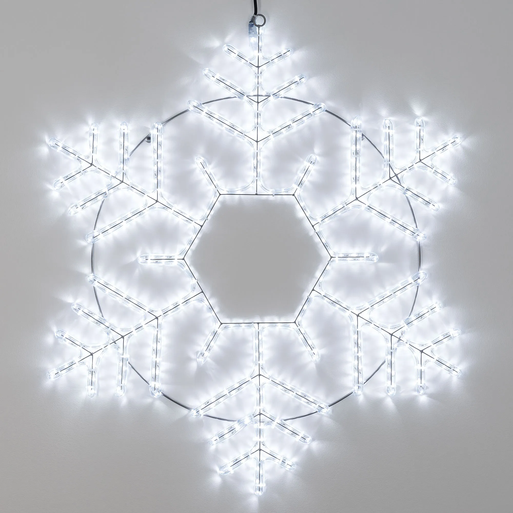 Светодиодная фигура СНЕЖИНКА. Размер 1000x900 мм. Цвет светодиодов БЕЛЫЙ (6000 К), постоянное свечение. 504 светодиодов. Напряжение питания 230 В, потребляемая мощность 31 Вт, степень пылевлагозащиты IP65. Фигура укомплектована проводом питания для подключения к сети 230 В (без вилки питания).
