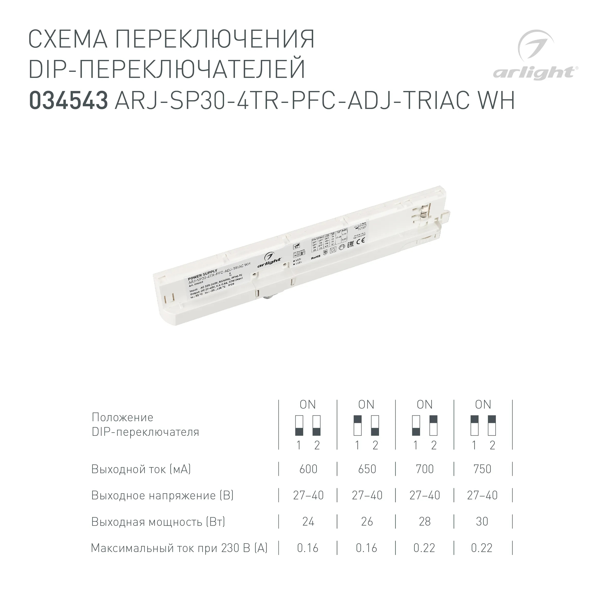 Блок питания для трековых систем ARJ-SP30-4TR-PFC-ADJ-TRIAC WH (30W, 0.6-0.75A, 27-40V) (Arlight, IP20 Пластик, 5 лет)