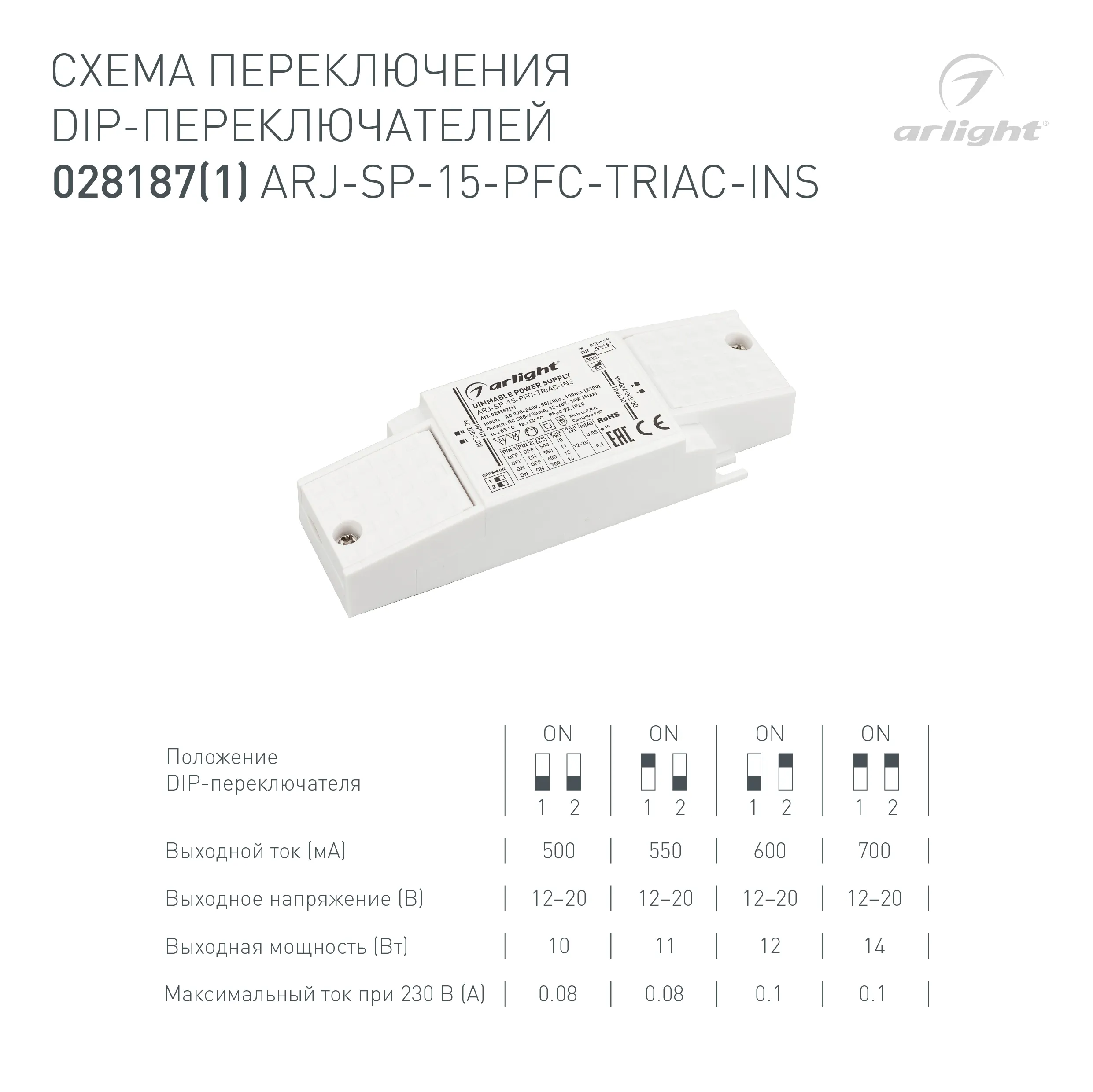 Блок питания ARJ-SP-15-PFC-TRIAC-INS (14W, 12-20V, 0.5-0.7A) (Arlight, IP20 Пластик, 5 лет)