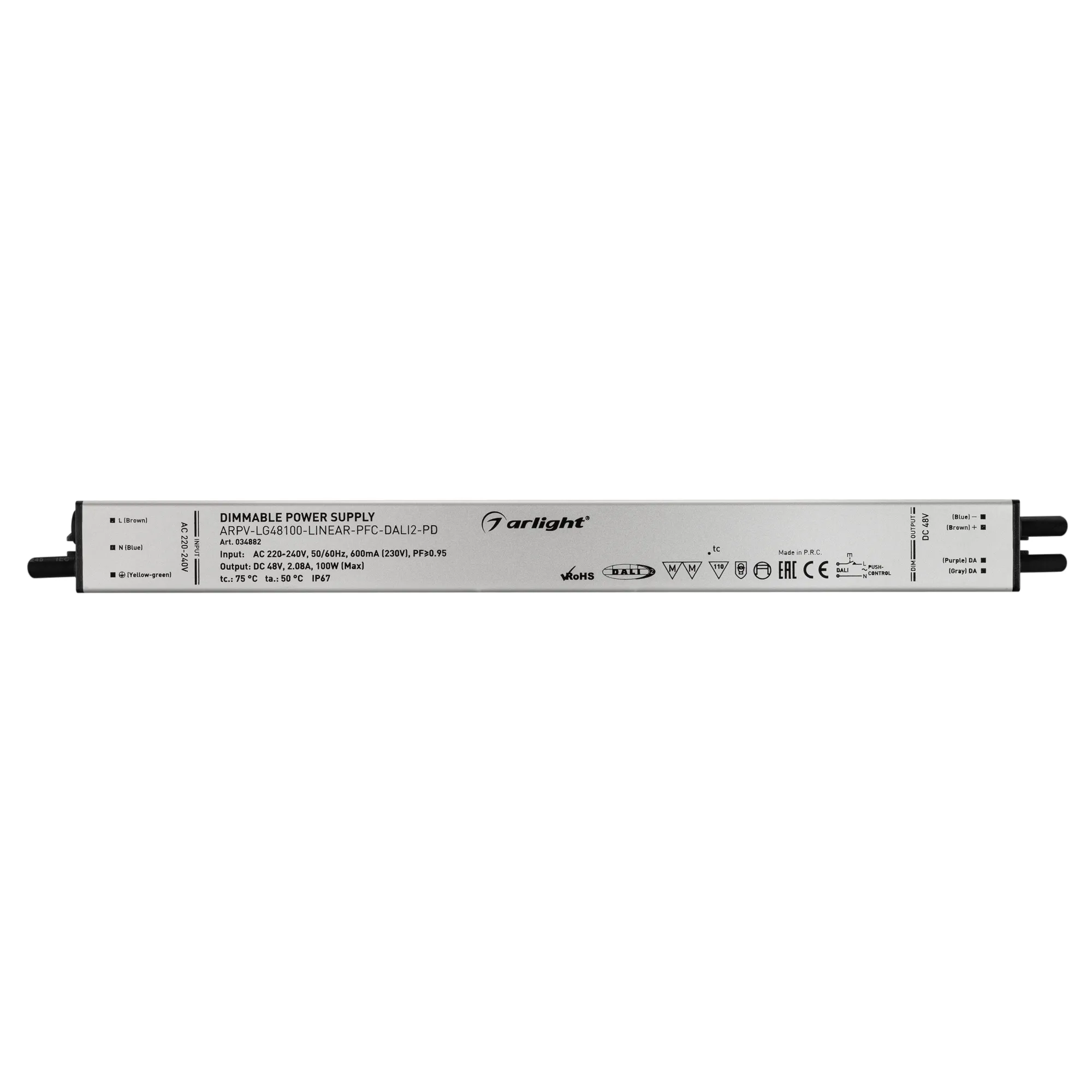 Диммируемый блок питания 48V с гальванической развязкой, ток 2.08А, 100Вт, с управлением DALI, c функцией PUSH-DIM, с корректором мощности, PF>0,95. Тонкий металлический корпус IP67. Вход: 220-240VAC. Выход: 48VDC, ШИМ 1кГц. Размер 320х30х21 mm.. Соответствует требованиям EMC. Гарантия 5 лет. Допускается использование только внутри помещений.