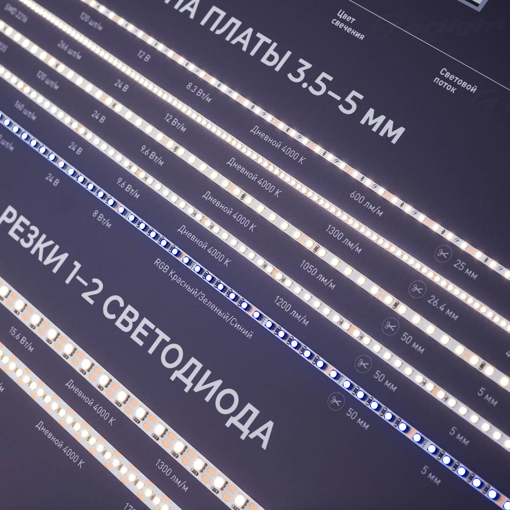 Стенд светодиодные ленты Специализированные - узкие, герметичные, волна и другие 12/24В, 30 моделей (ряды #60-#89).