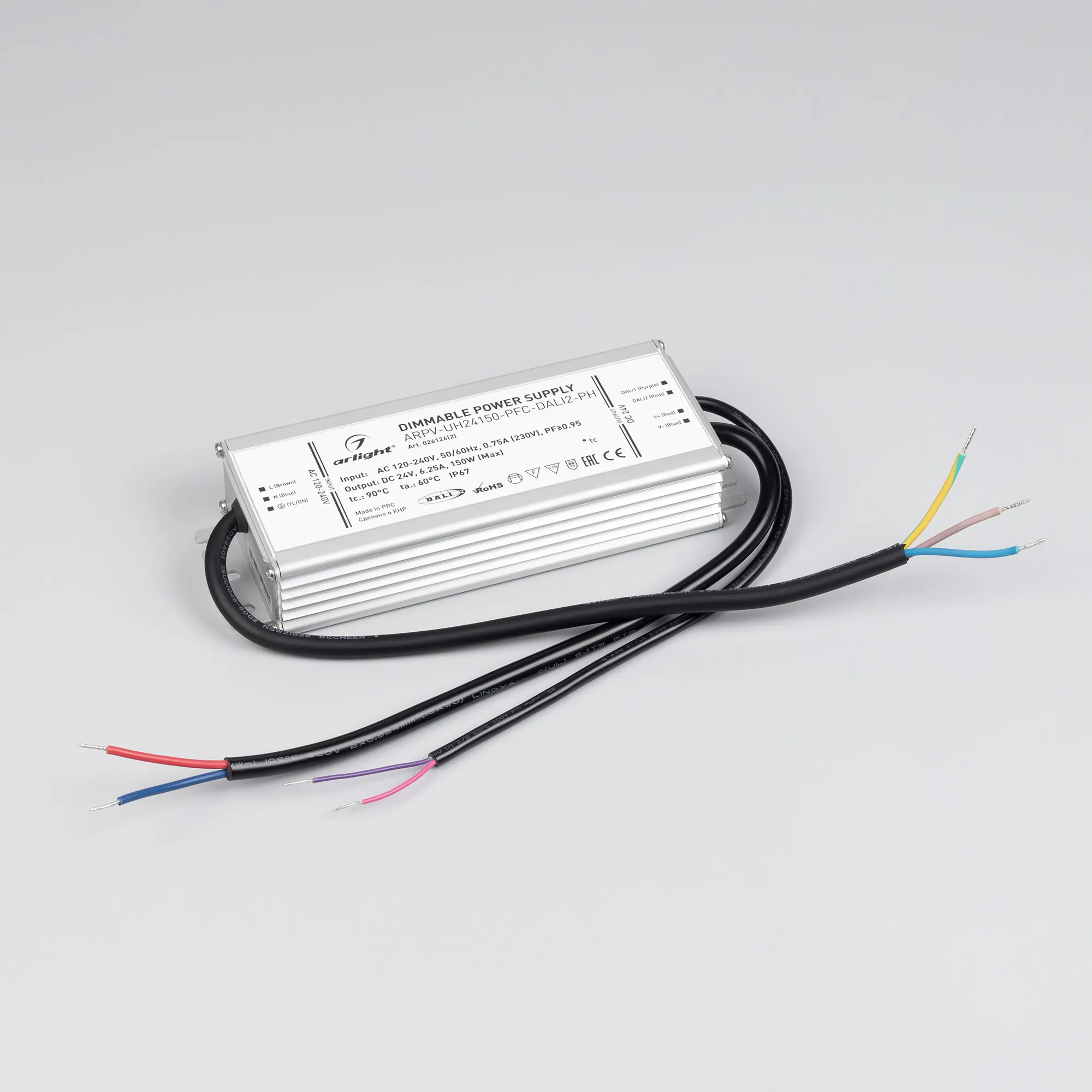 Диммируемый источник напряжения по протоколу DALI2.0 с гальванической развязкой для светодиодных изделий. Входное напряжение 120-240 VAC. Выходные параметры: 24 В, 6.3А, 150 Вт. Встроенный PFC >0.95. Герметичный алюминиевый корпус IP 67. Рабочая температура -40…+70C⁰. Габаритные размеры длина 188 мм, ширина 67.5 мм, высота 33.5 мм. Гарантийный срок 7 лет.