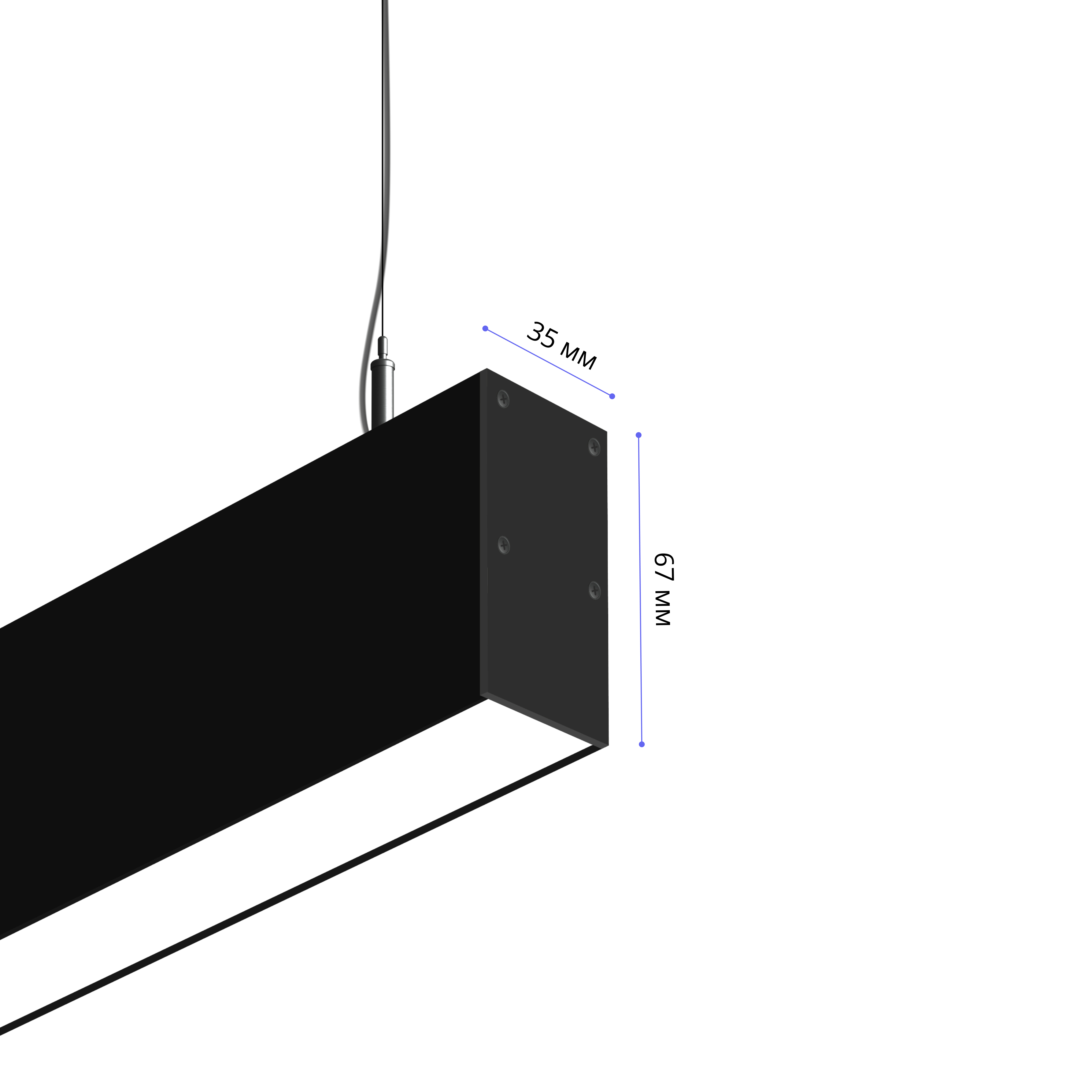 Подвесной светильник MS-LINEAR Линейный размер профиля 67х35мм длиной 2500мм мощностью 50W. Светильник собирается в алюминиевом корпусе с матовым рассеивателем, который дает равномерную засветку по всей площади.