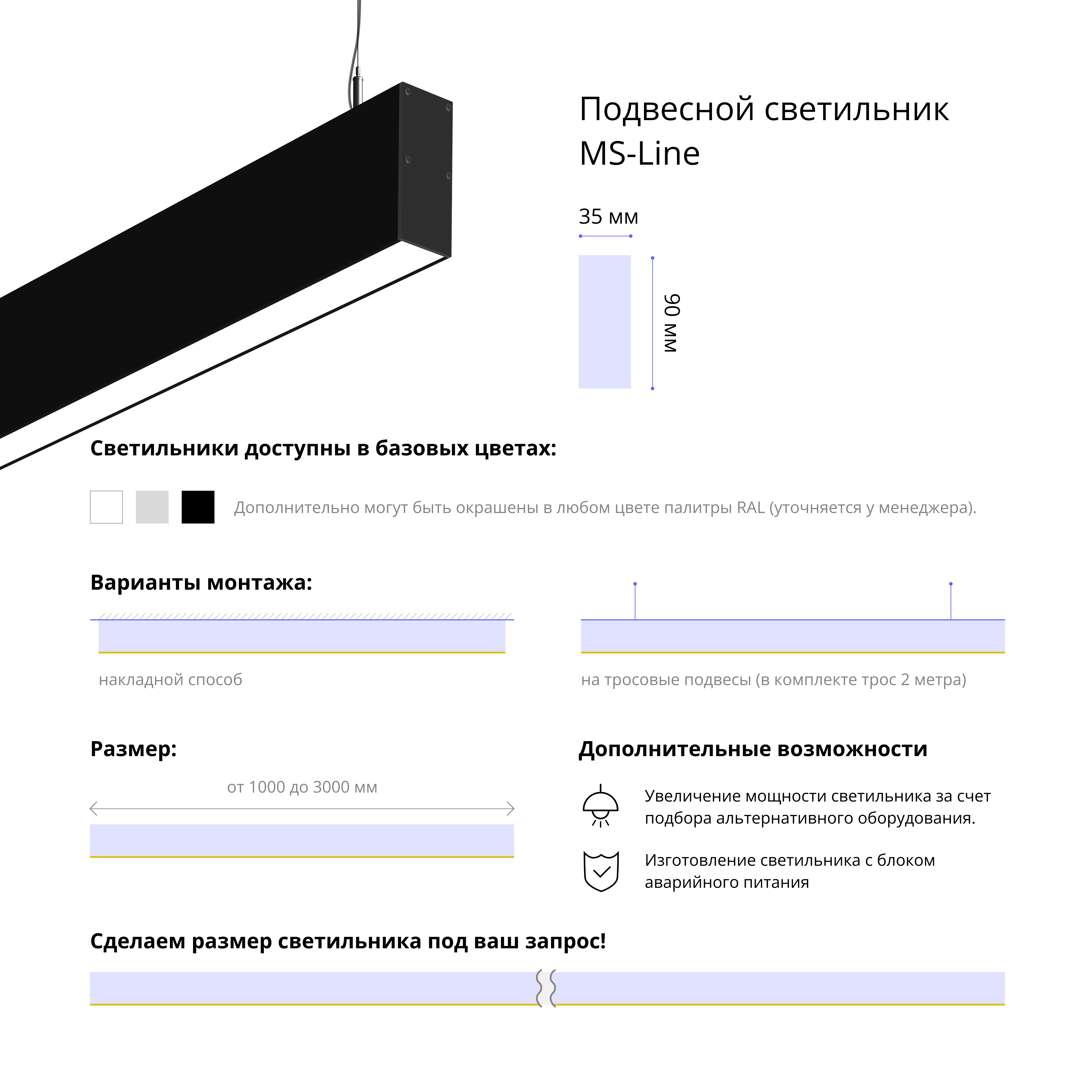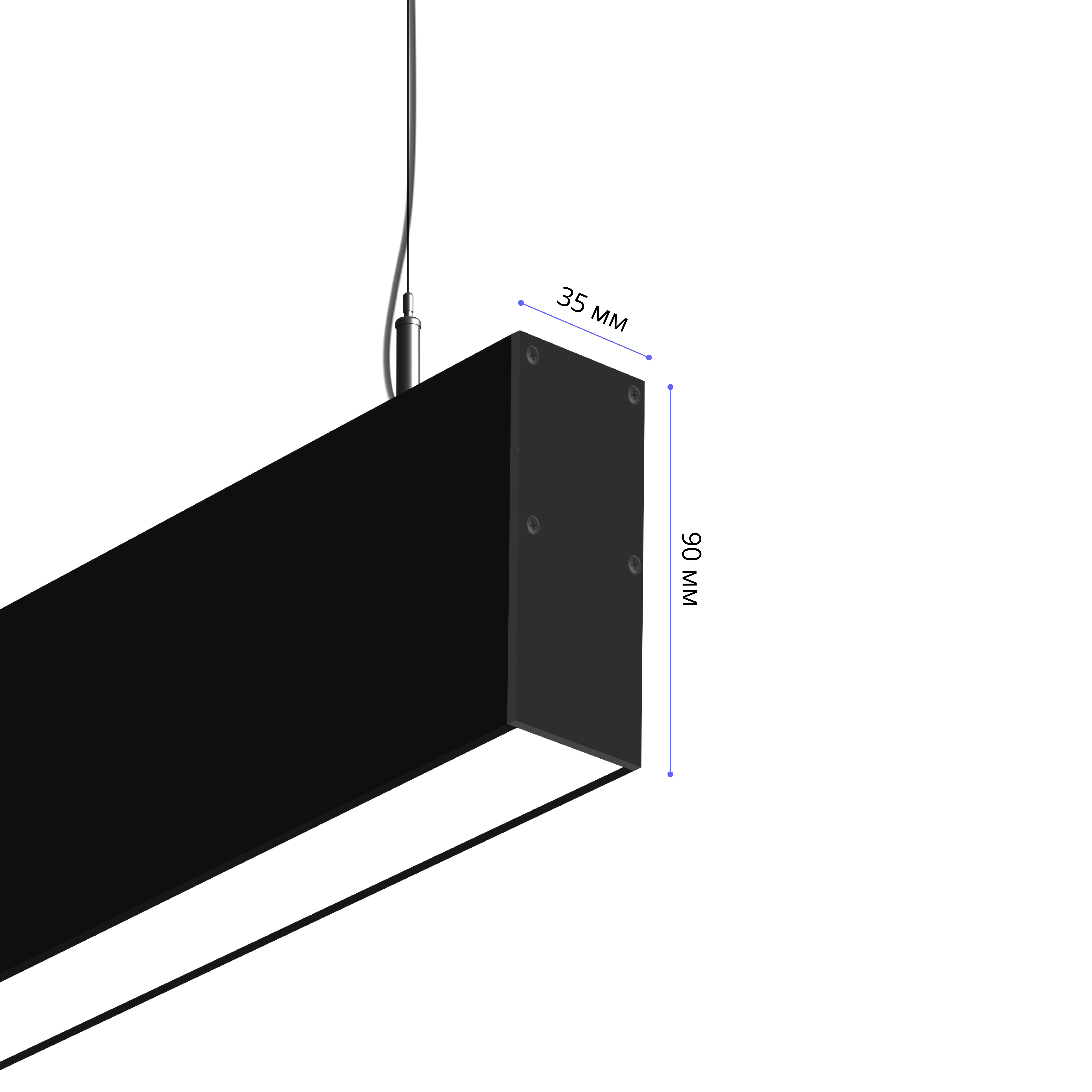 Подвесной светильник MS-LINEAR Линейный размер профиля 90х35мм длиной 3000мм мощностью 45W. Светильник собирается в алюминиевом корпусе с матовым рассеивателем, который дает равномерную засветку по всей площади.