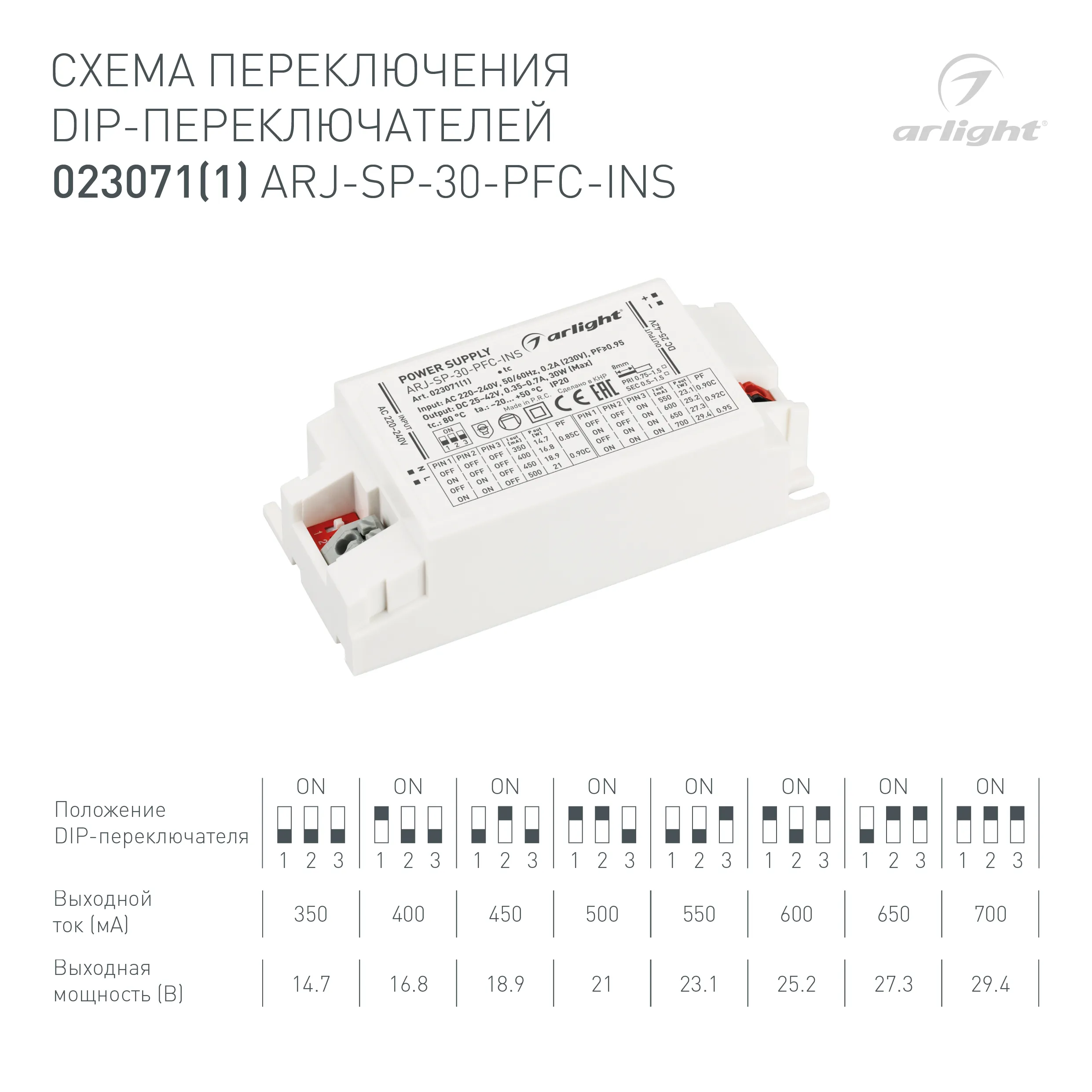 Блок питания ARJ-SP-30-PFC-INS (30W, 25-42V, 0.35-0.7A) (Arlight, IP20 Пластик, 5 лет)