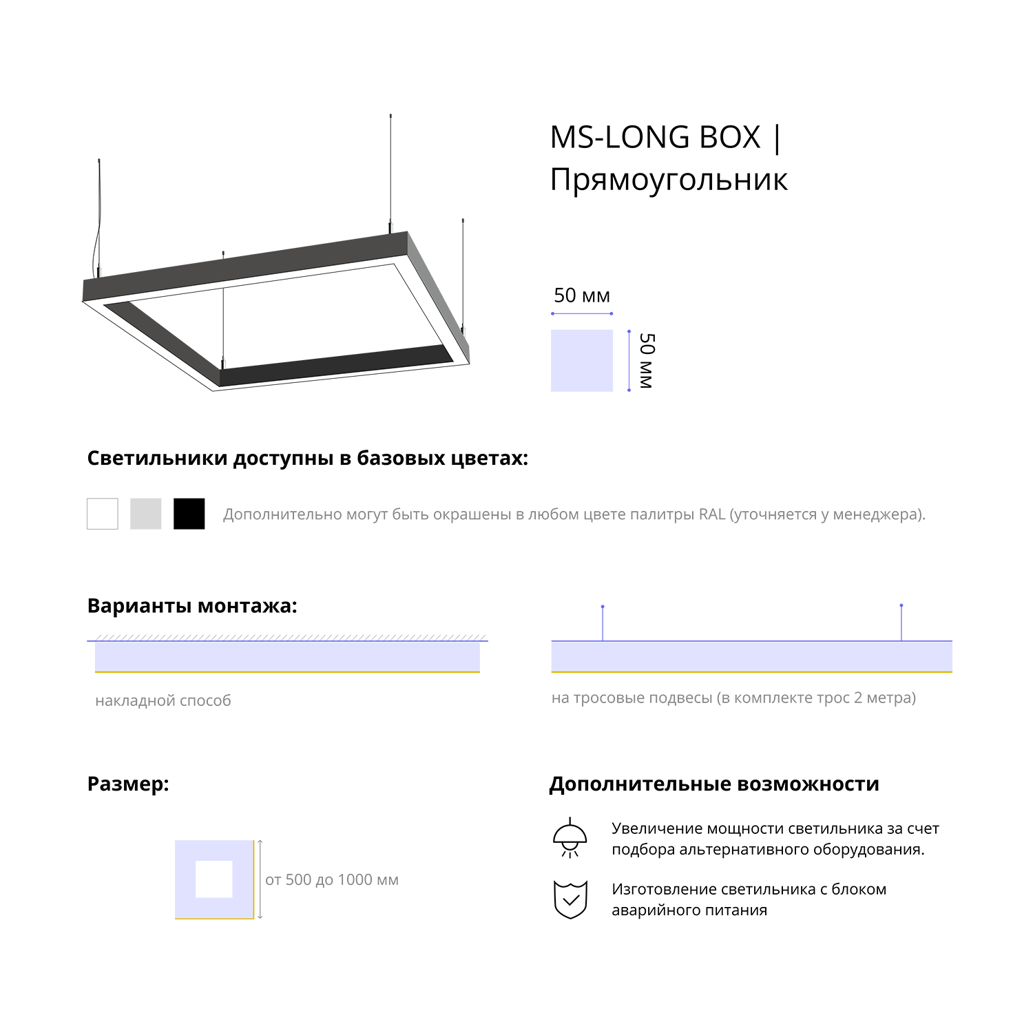 - Варианты монтажа: на тросовые подвесы (в комплекте трос 2 метра) и накладным способом.