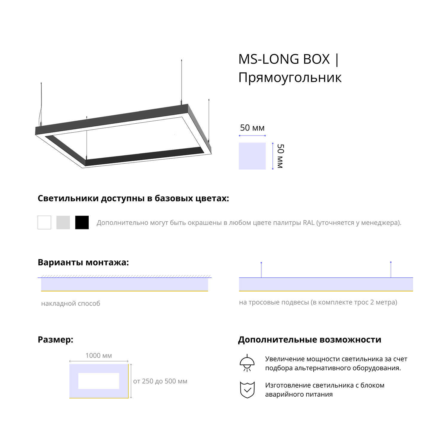 Cветодиодный фигурный светильник MS-LONG BOX Прямоугольник размер профиля 50x50мм длиной 1000х500мм мощностью 55W. Светильник собирается из алюминиевого основния с матовым рассеивателем, который дает равномерную засветку по всей площади.
