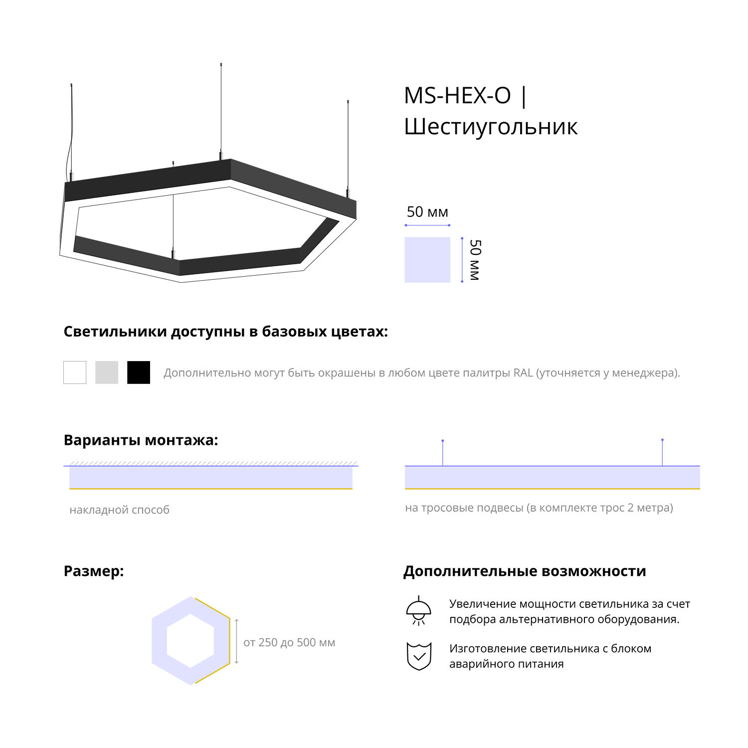 Cветодиодный фигурный светильник MS-HEX-O Шестиугольник размер профиля 50x50мм длиной 6х500мм мощностью 110W. Светильник собирается из алюминиевого основния с матовым рассеивателем, который дает равномерную засветку по всей площади.