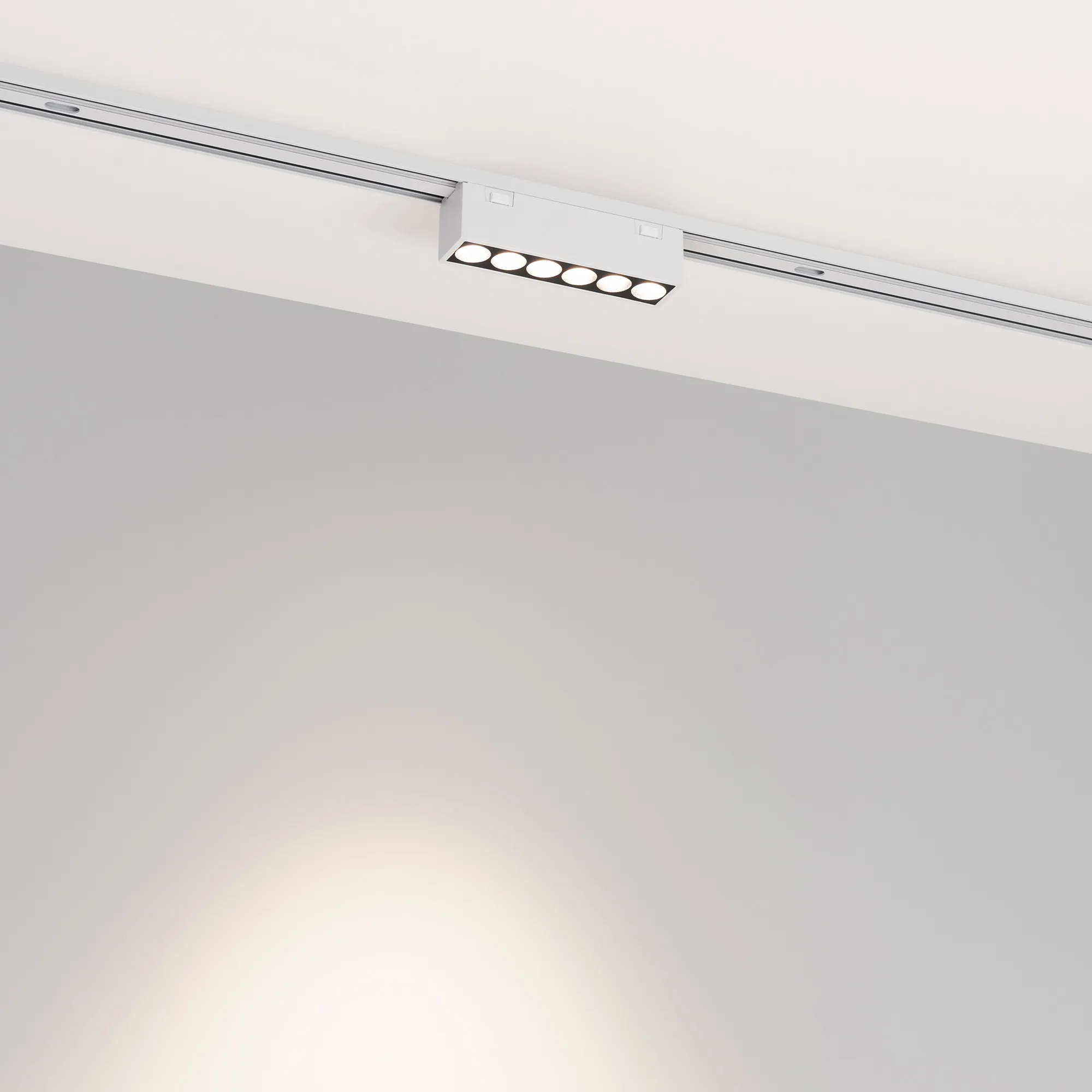 Светильник для магнитных треков MAG-VIBE. Мощность 6 Вт, св. поток 475 лм, 79 лм/Вт, теплый 3000 K, CRI>90, угол 24°, напряжение питания 48 В. Белый прямоугольный корпус из алюминия, экран поликарбонат, степень защиты IP20. Размер: длина 101 мм, ширина 25 мм, высота 29 мм. Монтаж на трек MAG-VIBE. Пульсация <1%.
