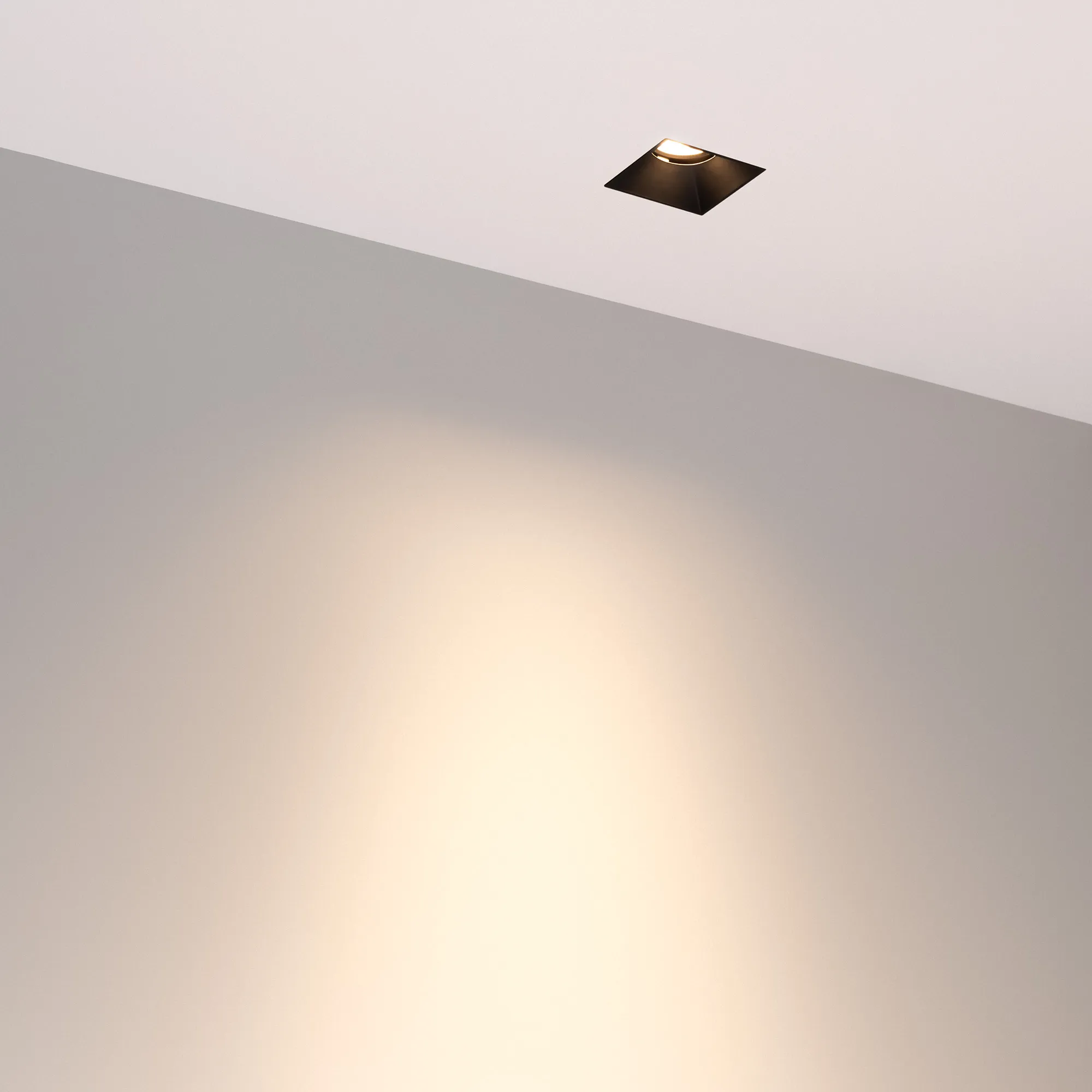 Встраиваемый безрамочный светильник под шпаклевку. Мощность 9 Вт, св. поток 640 лм, 71 лм/Вт, тёплый 3000 K, CRI>90, угол 36°, напряжение питания 230 В. Чёрный квадратный корпус, экран PMMA, степень защиты IP20. Размер: длина 65 мм, ширина 65 мм, высота 63 мм, размер отражателя 40x40 мм. Монтаж встраиваемый, установочное отверстие длина 45 мм, ширина 45 мм. Драйвер 26-40 В, 200 мА, пульсация <2%.