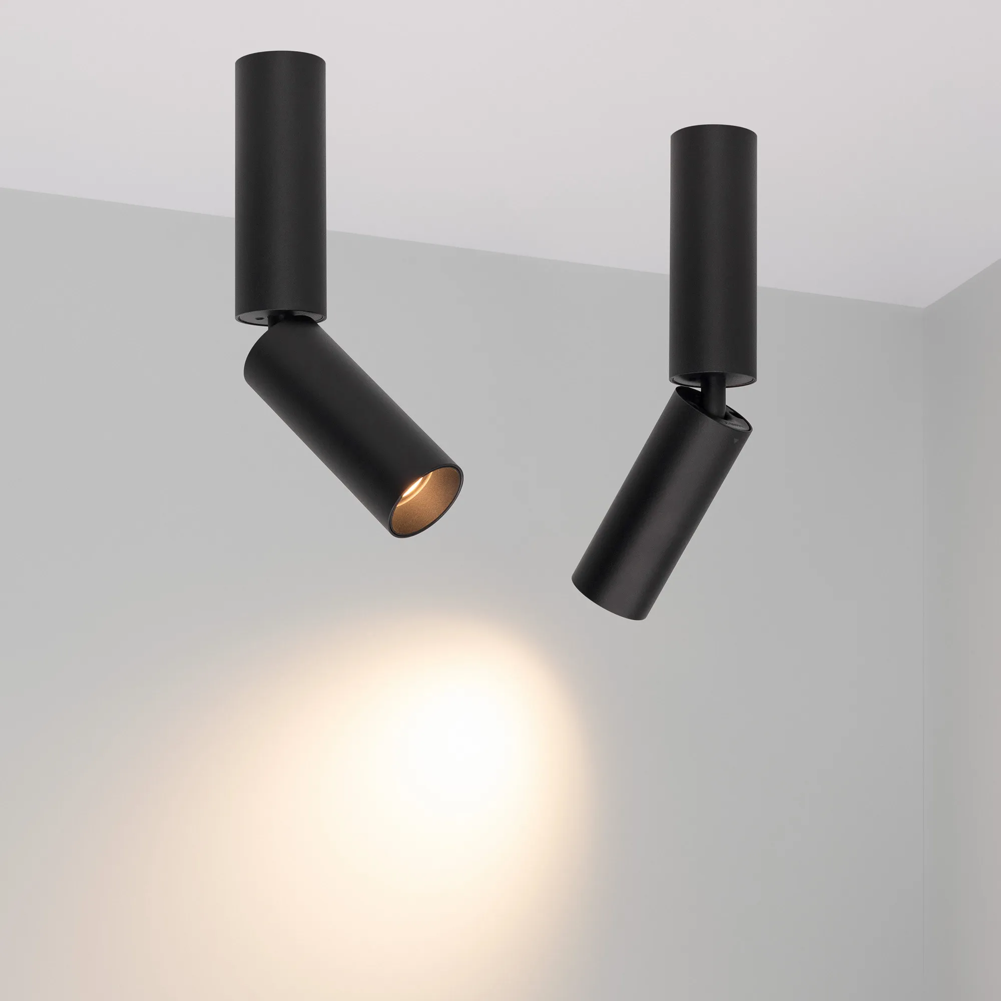 Накладной откидной светильник. Мощность 7 Вт, св. поток 490 лм, 70 лм/Вт, теплый 3000 K, CRI>90, угол 36°, напряжение питания 230 В. Черный круглый корпус из алюминия, экран поликарбонат, степень защиты IP40. Размер: диаметр 35 мм, высота светового модуля 90 мм, высота основания 100 мм. Угол поворота 350°, угол наклона 90°. Монтаж накладной. Встроенный драйвер 8,5-40 В, 150 мА, пульсация <1%. Размеры штатного драйвера 100*38*25 мм