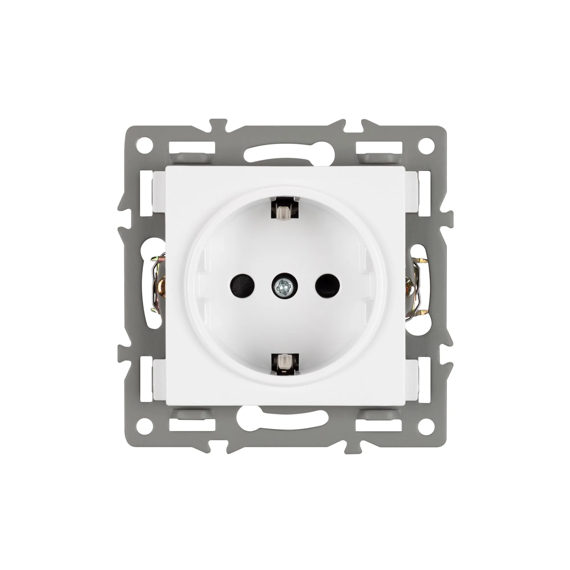 Механизм розетки с заземлением на 1 пост, с суппортом из алюминия. Цвет - белый. Степень пылевлагозащиты - IP20.