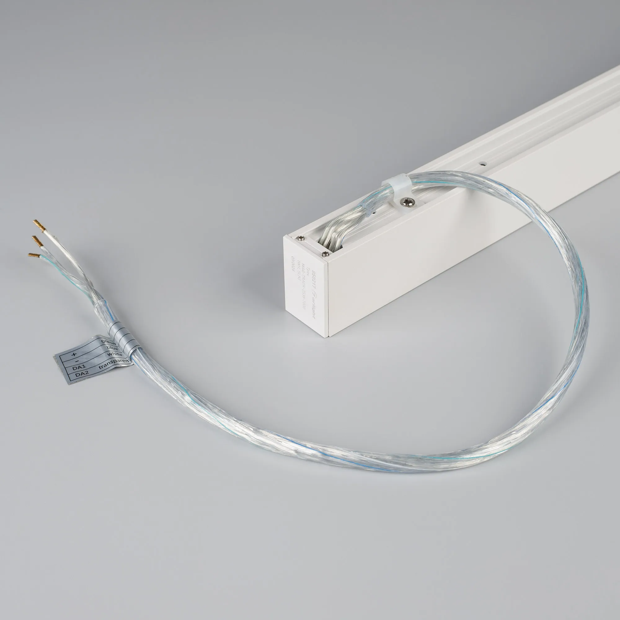 Подвесной, накладной магнитный трек, длина 1000 мм. DC24V, позволяет диммировать светильники по протоколу DALI. Материал алюминий, цвет белый. Две заглушки в комплекте. Размер ДxШxВ: 1003x25x38 мм. Размер (с учетом заглушек). Аксессуары для подвесного монтажа в комплект не входят. К плате идет провод 24В длиной 1м.