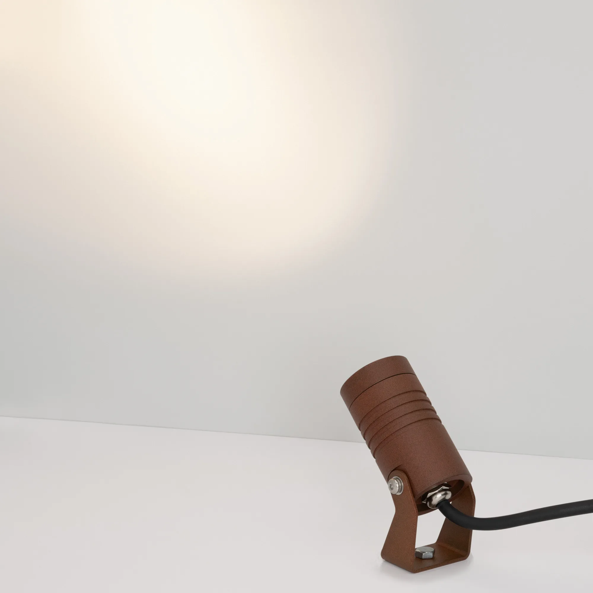 Уличный светодиодный прожектор, мощность 5Вт, угол освещения 25°. Цвет ДНЕВНОЙ 4000К, световой поток 310лм. Влагозащищенный корпус IP67 - цвет кортен - алюминий, экран из закалённого стекла. Угол поворота корпуса в вертикальной плоскости 135°. Питание 230В, мощность 5 Вт. Размеры DxH -Ø42х77мм. В комплекте 1м провод.