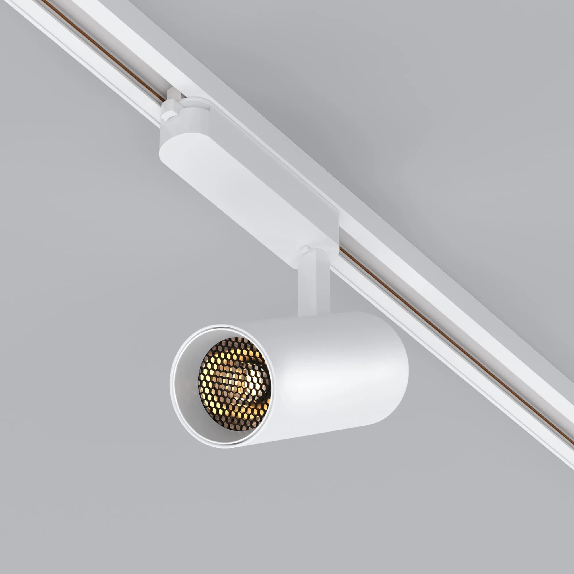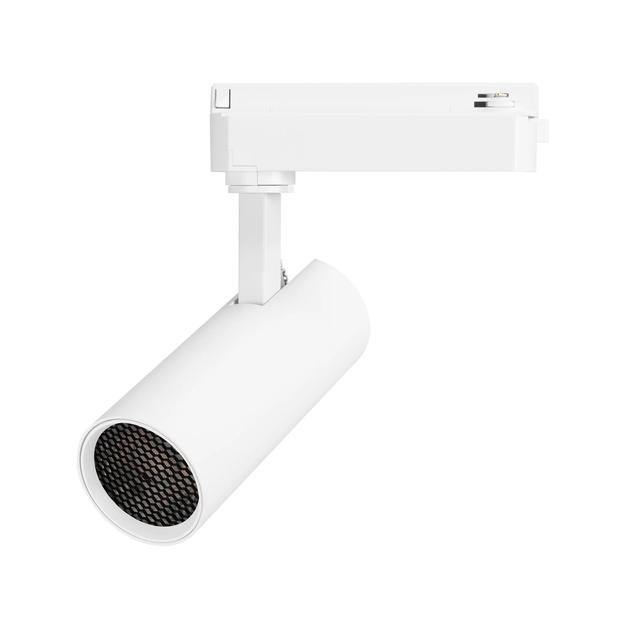 Светильник для треков/шин 2 провода. Мощность 15 Вт, св. поток без решетки honeycomb 1500 лм, 100 лм/Вт, с решеткой honeycomb 990 лм, 66 лм/Вт, тёплый 3000 K, CRI>90, угол 15°, напряжение питания 230 В. Белый круглый корпус из алюминия, материал линзы PMMA, степень защиты IP20. Размер: диаметр 60 мм, длина световой части 141 мм. Монтаж на трек 1-фазный. Драйвер встроенный 350 мА 25-40 В, пульсация <5%.