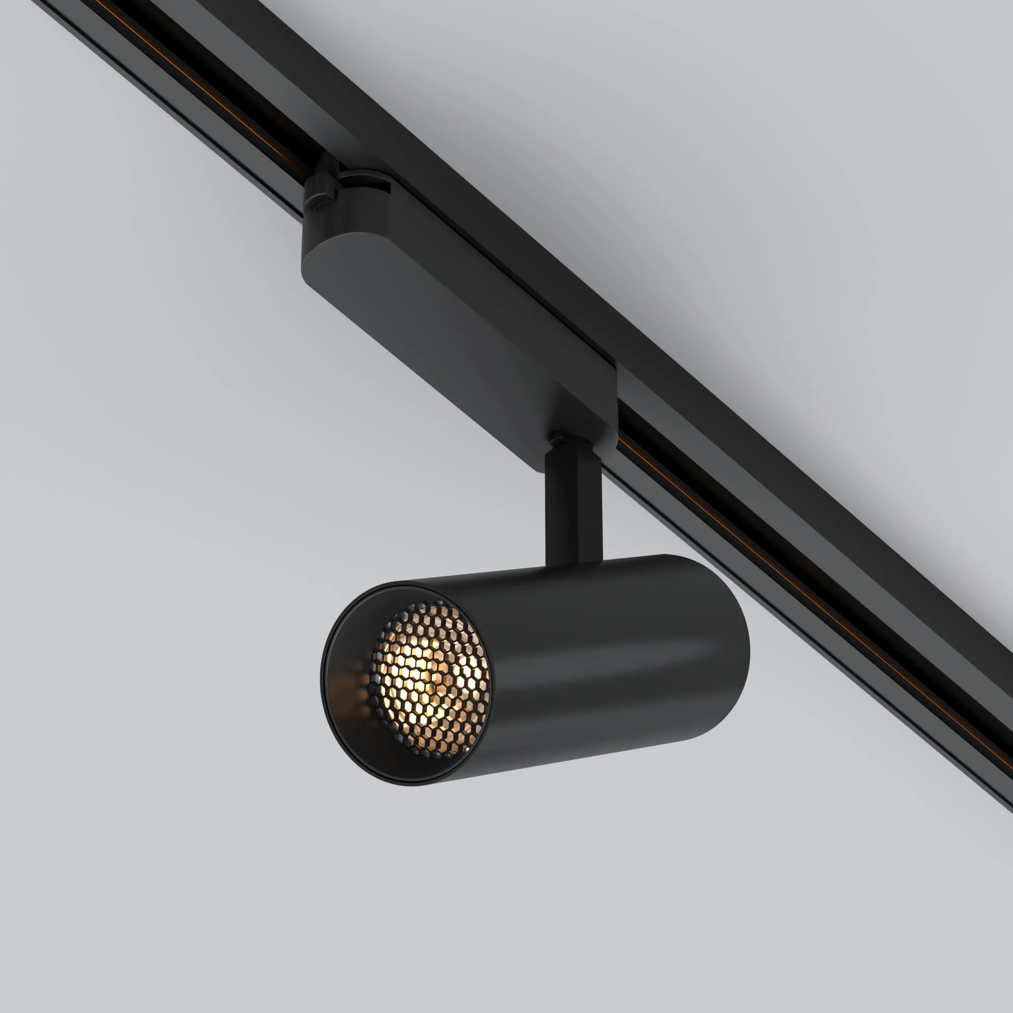 Светильник для треков/шин 2 провода. Мощность 10 Вт, св. поток без решетки honeycomb 1000 лм, 100 лм/Вт, с решеткой honeycomb 660 лм, 66 лм/Вт, теплый 3000 K, CRI>90, угол 36°, напряжение питания 230 В. Черный круглый корпус из алюминия, материал линзы PMMA, степень защиты IP20. Размер: диаметр 55 мм, длина световой части 141 мм. Монтаж на трек 1-фазный. Драйвер встроенный 25-40 В, 250мА., пульсация <5%.