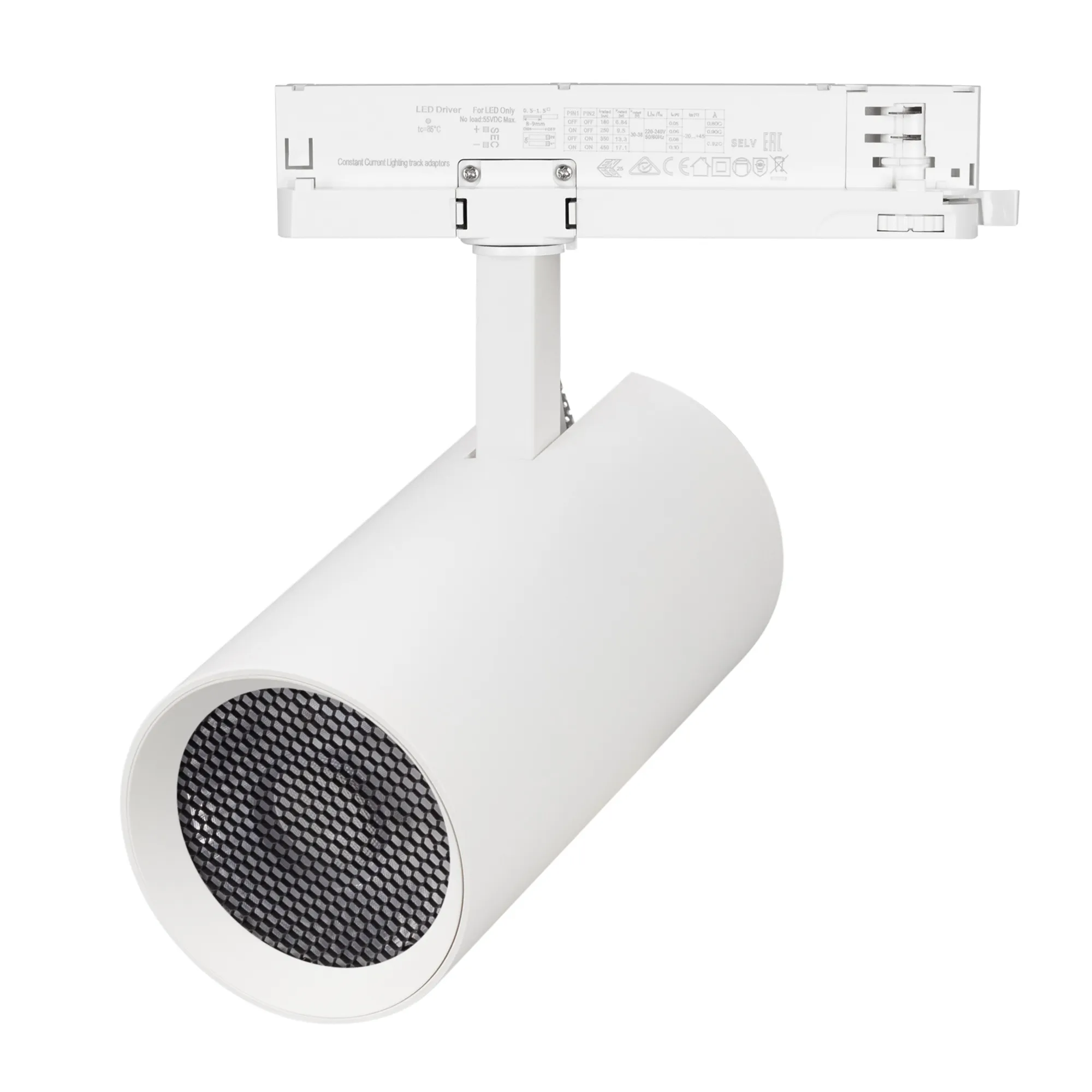Светильник для треков/шин 4 провода. Мощность 30 Вт, св. поток без решетки honeycomb 3000 лм, 100 лм/Вт, с решеткой honeycomb 1980 лм, 66 лм/Вт, дневной 4000 K, CRI>90, угол 24°, напряжение питания 230 В. Белый круглый корпус из алюминия, материал линзы PMMA, степень защиты IP20. Размер: диаметр 90 мм, длина световой части 141 мм. Монтаж на трек 3-фазный. Драйвер встроенный 24-42 В, 750мА., пульсация <5%