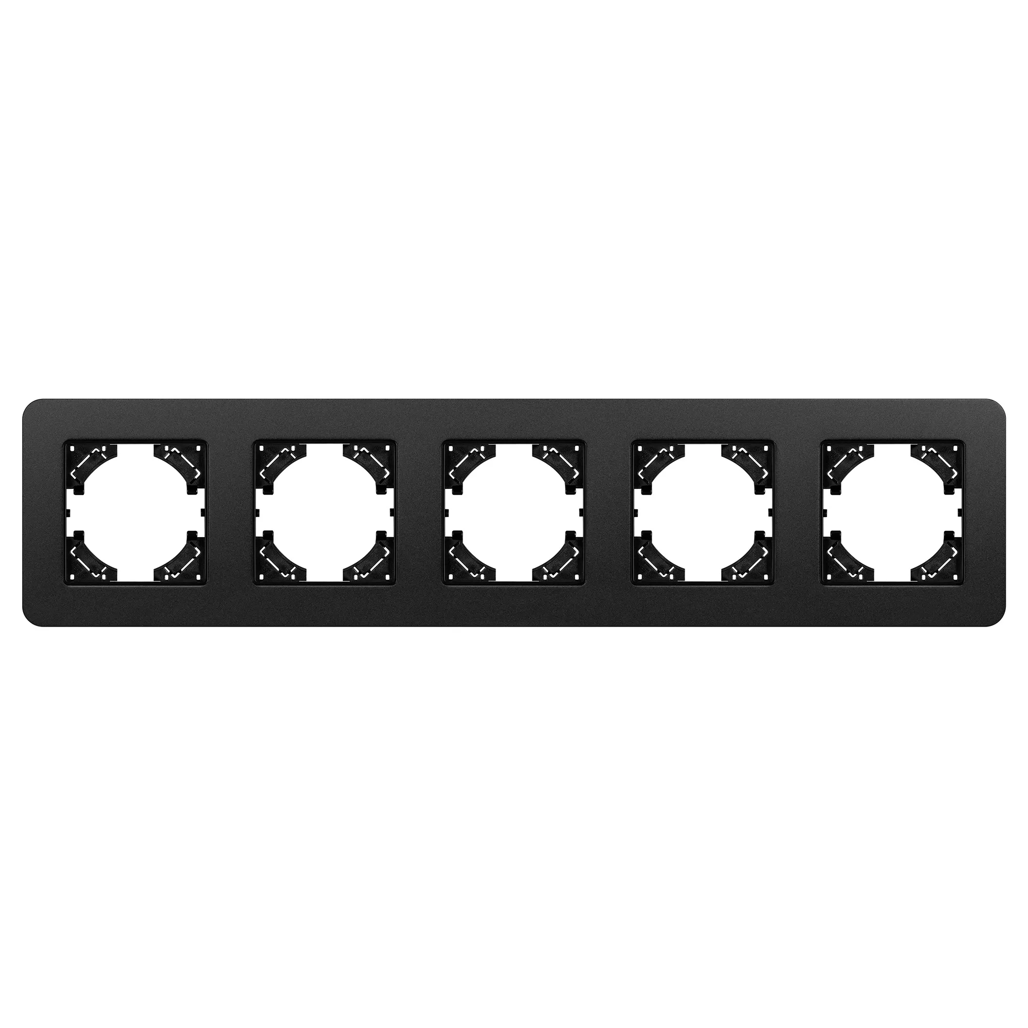 Рамка алюминиевая на 5 постов, под встраиваемый механизм. Цвет - черный с Soft-Touch покрытием. Среднего уровня герметичности IP20. Ориентация монтажа - горизонтальная (основным ориентиром служат посадочные выступы для накладки механизма).
