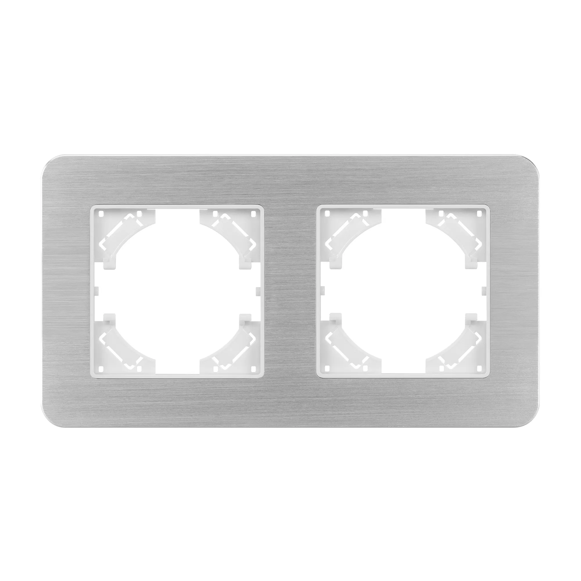 Рамка алюминиевая на 2 поста, под встраиваемый механизм. Цвет - серебристый. Среднего уровня герметичности IP20. Ориентация монтажа - горизонтальная (основным ориентиром служат посадочные выступы для накладки механизма).