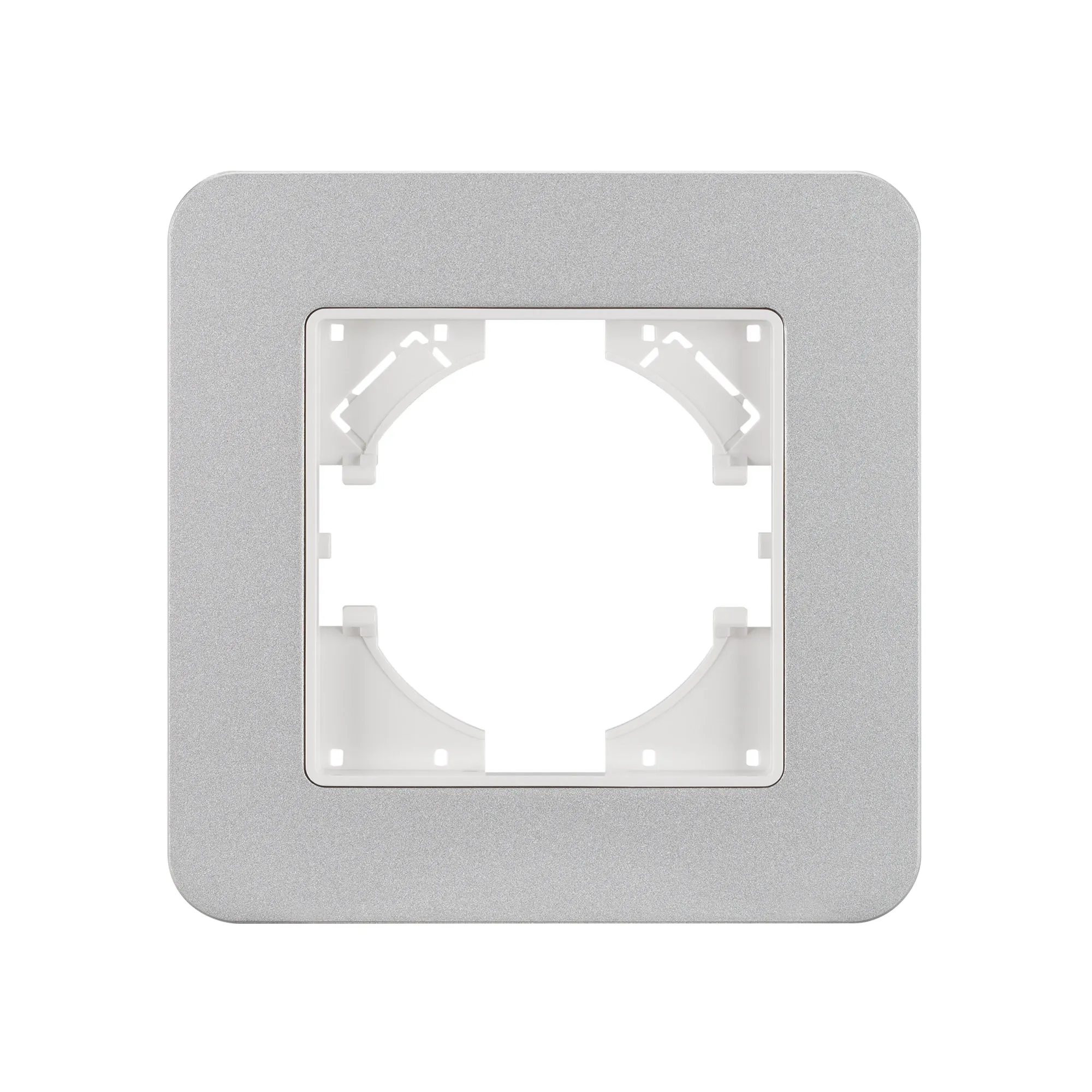 Рамка алюминиевая на 1 пост, под встраиваемый механизм. Цвет - серебристый с Soft-Touch покрытием. Среднего уровня герметичности IP20. Ориентация монтажа - горизонтальная (основным ориентиром служат посадочные выступы для накладки механизма).