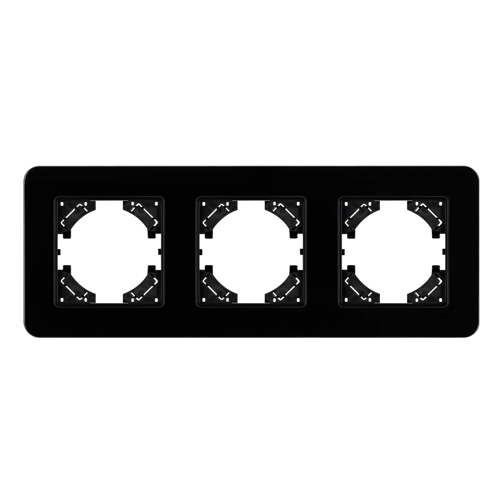 Рамка стеклянная на 3 поста, под встраиваемый механизм. Цвет - черный. Среднего уровня герметичности IP20. Ориентация монтажа - горизонтальная (основным ориентиром служат посадочные выступы для накладки механизма).