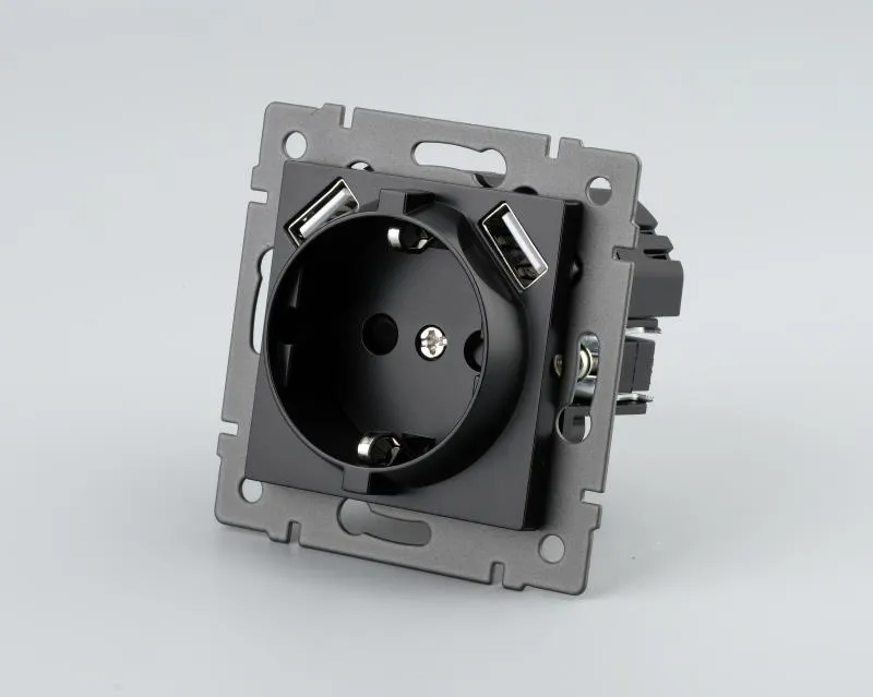 Механизм розетки с заземлением на 1 пост и 2USB Type A порта. Цвет - черный. Без фронтальной рамки. Уровень пылевлагозащиты IP20. Устанавливается в стандартный подрозетник.