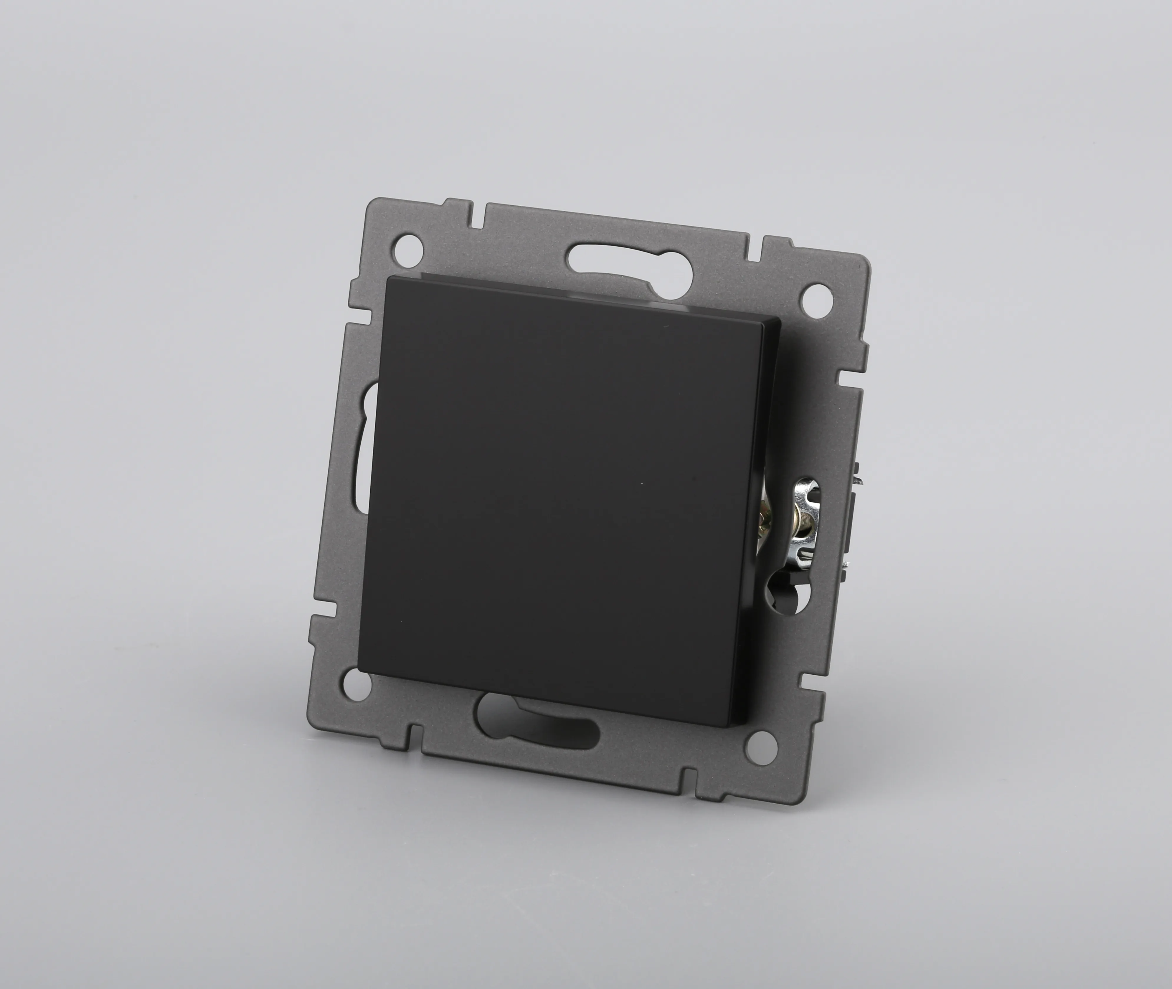 Механизм выключателя света клавишный на 1 пост 1 клавиша (непроходной). Цвет - черный. Без фронтальной рамки. Уровень пылевлагозащиты IP20. Выключатель устанавливается в стандартный круглый подрозетник.