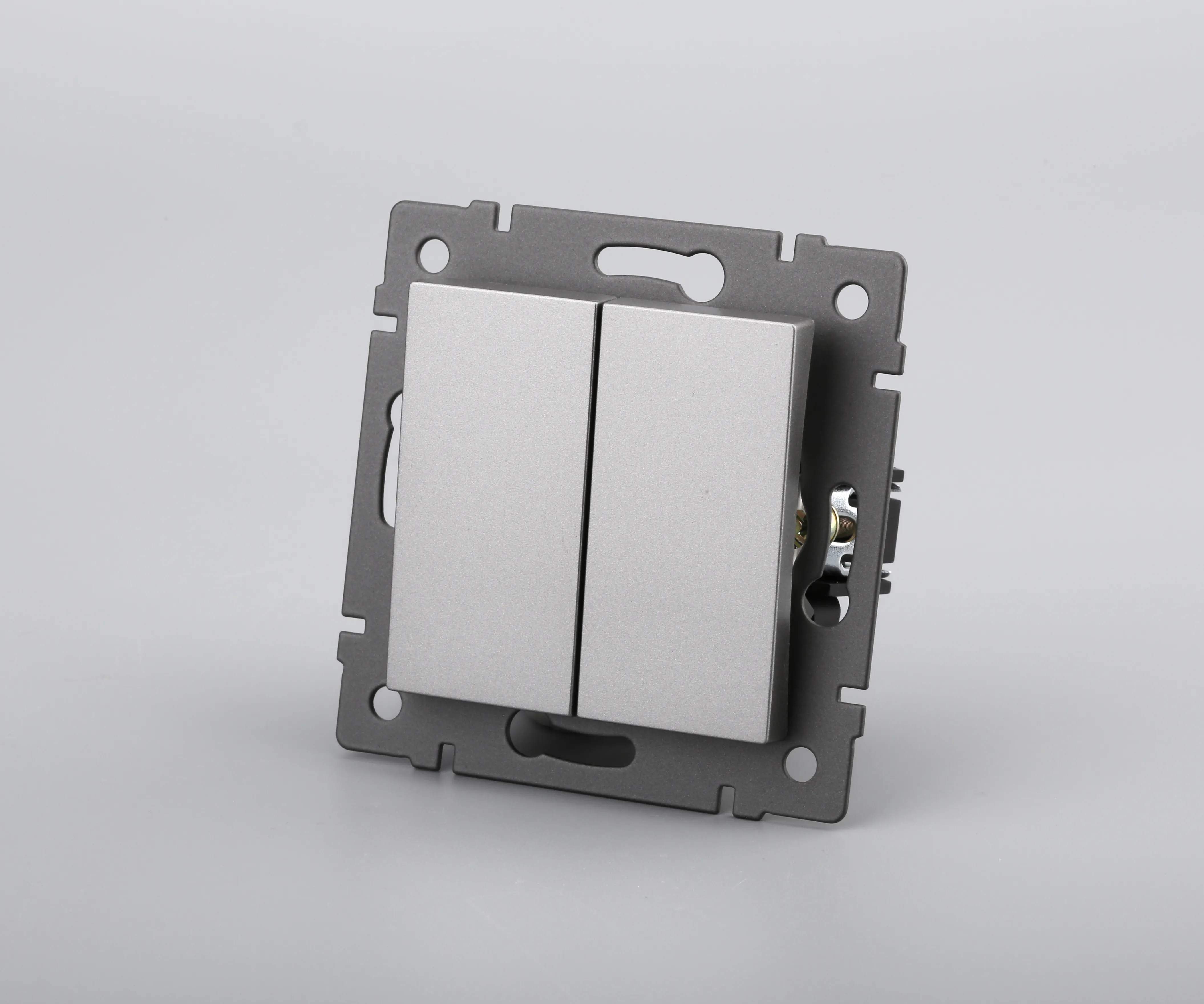 Механизм выключателя света клавишный на 1 пост 2 клавиши (непроходной). Цвет - серый. Без фронтальной рамки. Уровень пылевлагозащиты IP20. Выключатель устанавливается в стандартный круглый подрозетник.