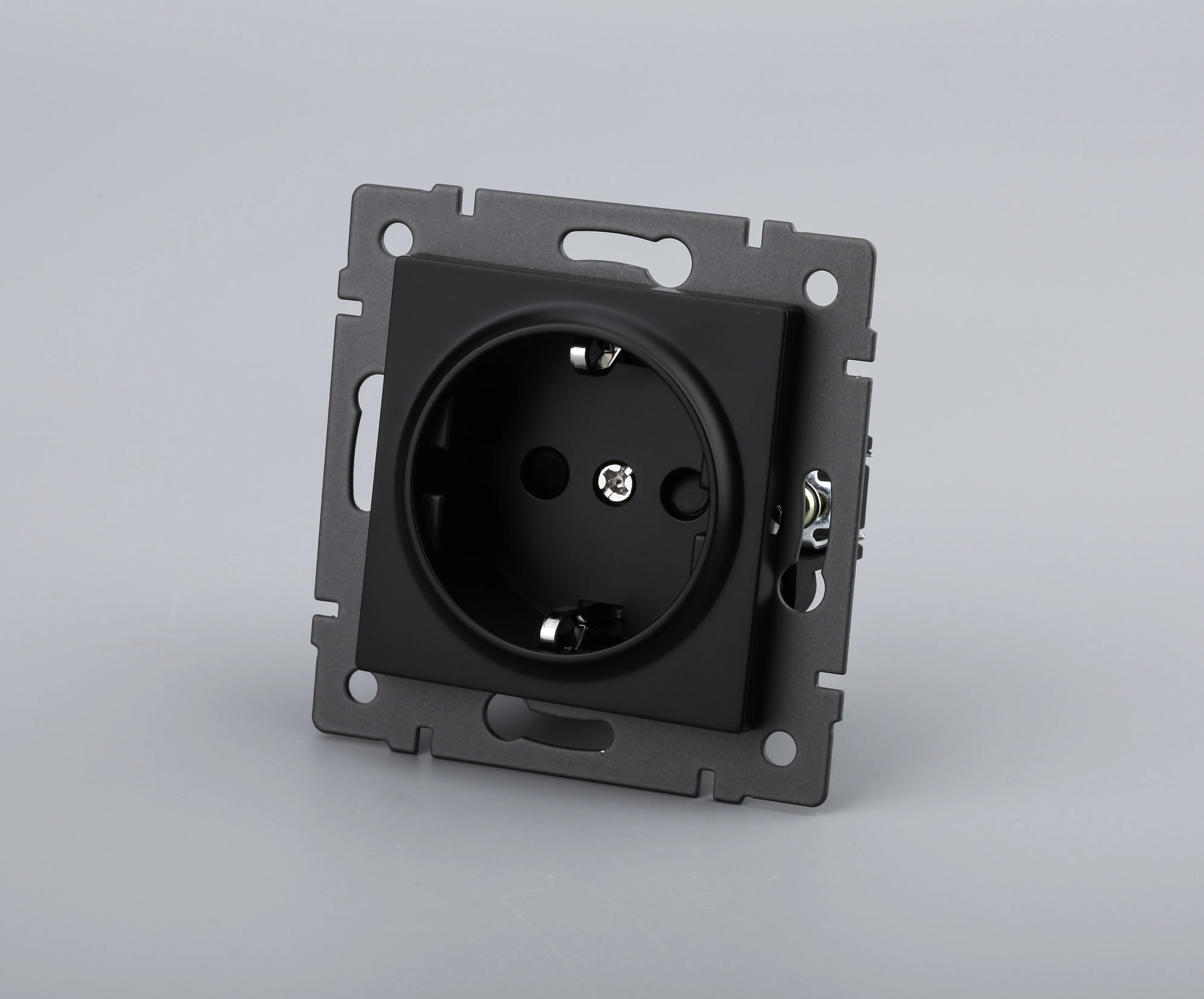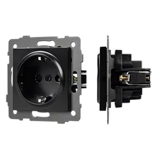 Механизм розетки с заземлением на 1 пост. Цвет - черный. Без фронтальной рамки. Уровень пылевлагозащиты IP20. Устанавливается в стандартный подрозетник.