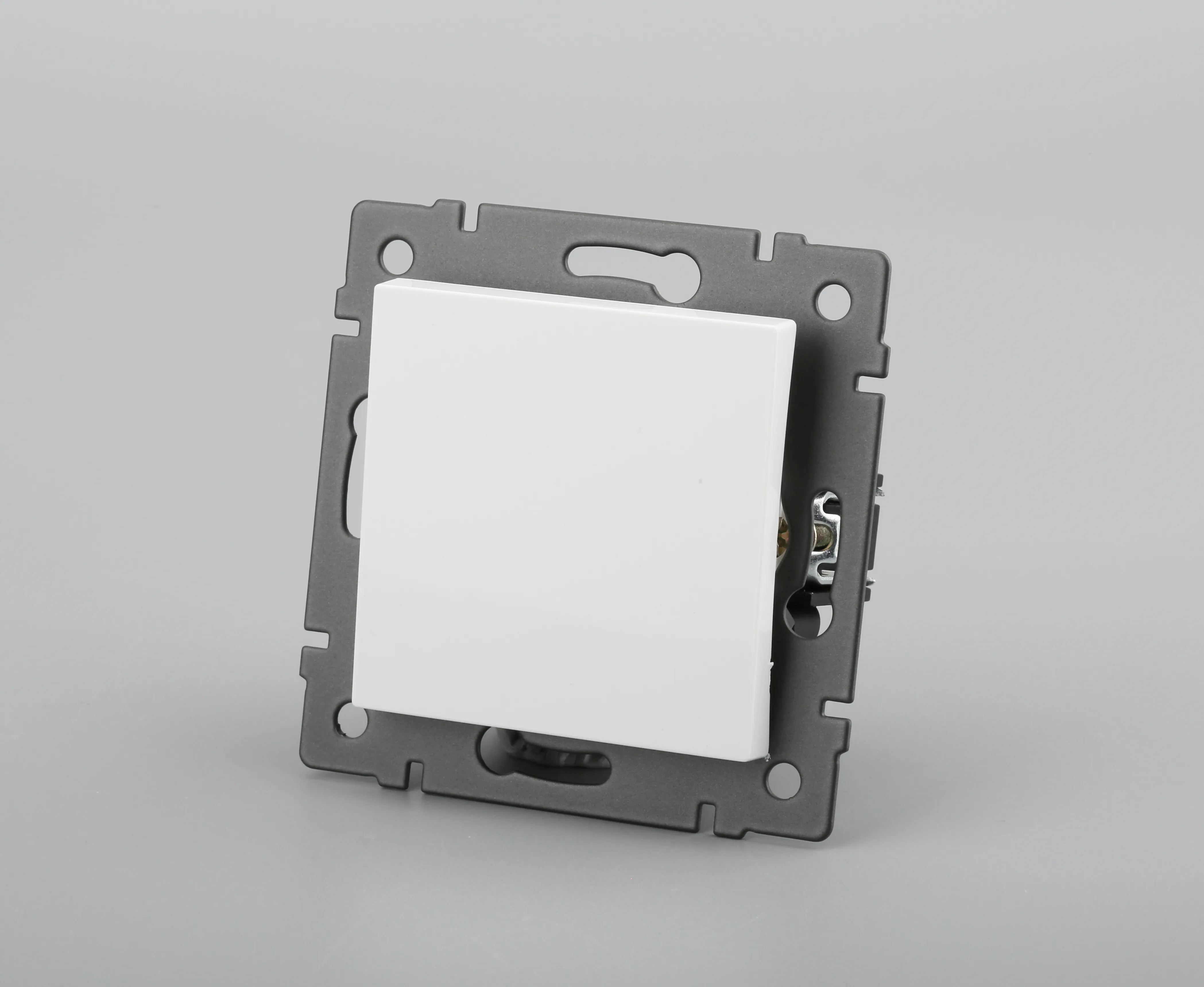 Механизм выключателя света клавишный на 1 пост 1 клавиша (проходной). Цвет - белый. Без фронтальной рамки. Уровень пылевлагозащиты IP20. Выключатель устанавливается в стандартный круглый подрозетник.