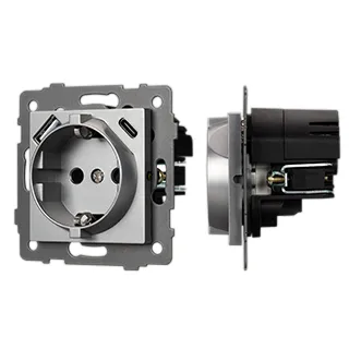 Механизм розетки с заземлением 1 пост 2 USB Type A+C порта. Цвет - серый. Без фронтальной рамки. Уровень пылевлагозащиты IP20. Устанавливается в стандартный подрозетник.