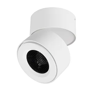 Накладной откидной поворотный светильник с изменяемой цветовой температурой. Мощность 12 Вт, св. поток с решеткой honeycomb 750 лм, св. эффективность 62 лм/Вт, теплый 2700 K, теплый 3200 K, дневной 4000K (переключается), CRI>90, угол свечения 15°, угол поворота 360°, угол наклона 90°. Белый круглый корпус из алюминия, степень защиты IP20. Размер: диаметр Ø85 мм, высота 95 мм. Питание AC 220-240V, 12Вт, драйвер встроенный (300mA, 27-43V). Пульсация <1%.