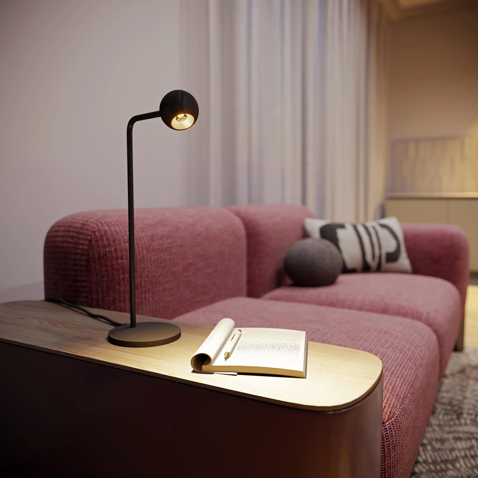 Декоративный настольный светильник. Мощность 6 Вт, св. поток 540 лм, 90 лм/Вт, теплый 3000К, CRI>90, угол 30°, напряжение питания 230 В.Бронзовый корпус из алюминия (основание, ножка, светоизлучаль в форме шара), степень защиты IP20. Размер основания Ø140×11 мм, размер ножки Ø12,5×430х120 мм, размер светоизлучателя Ø65×55,5 мм. Длина провода 1580 мм, питание от сети 220-240V., пульсация <1%