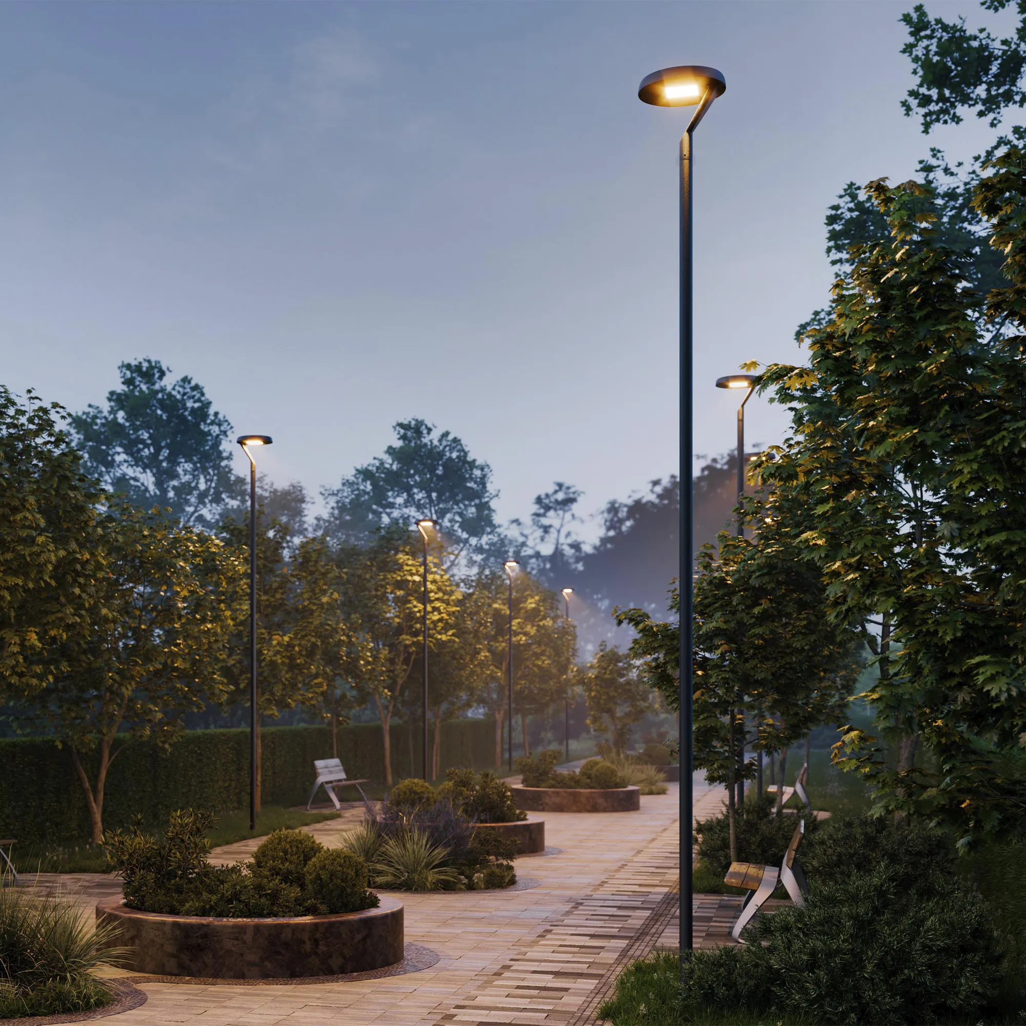 Венчающий светодиодный светильник. Мощность 50 Вт, св. поток 7100 лм, 141 лм/Вт, тёплый 3000 K, CRI>80, угол 145x40°, напряжение питания 230 В. Черный корпус из алюминия, экран закаленное стекло, степень защиты IP65. Размер: диаметр 510 мм, высота 480 мм. Монтаж на вертикальную опору диаметром 76 мм.