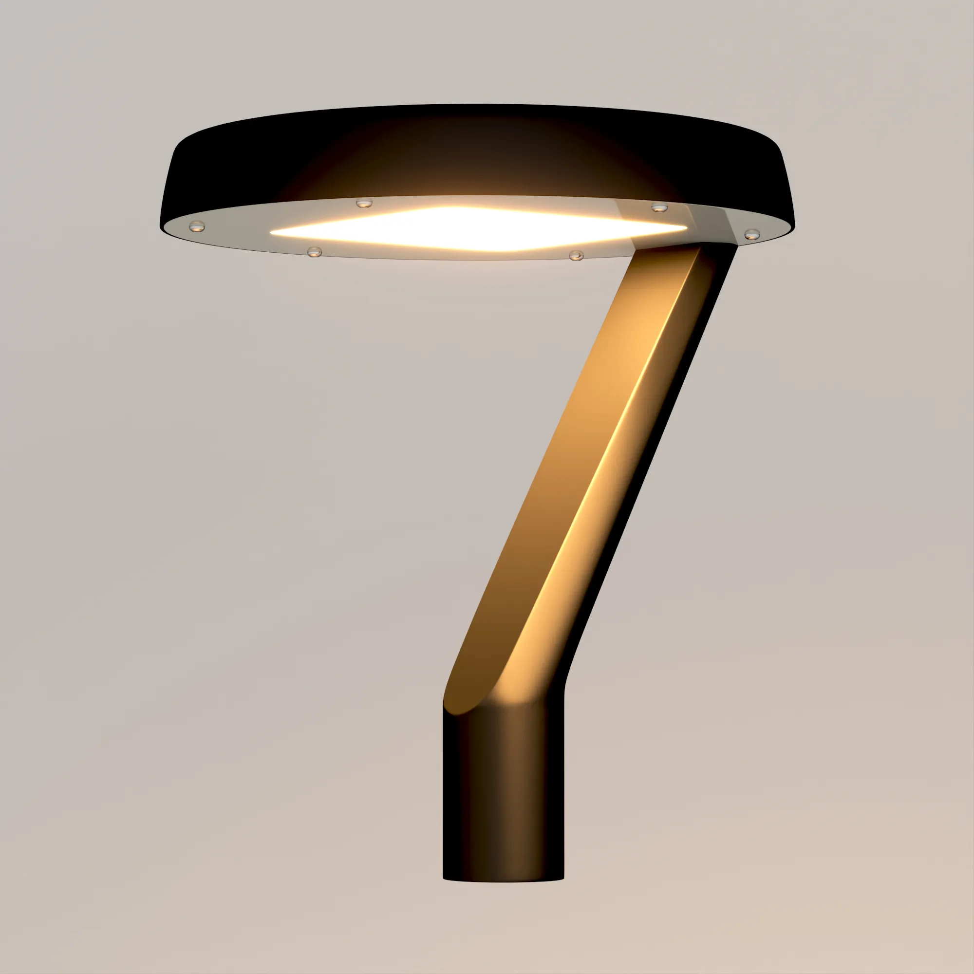 Поставка под заказ от 5 шт. Венчающий светодиодный светильник. Мощность 50 Вт, св. поток 7100 лм, 141 лм/Вт, дневной 4000 K, CRI>80, угол 145x40°, напряжение питания 230 В. Черный корпус из алюминия, экран закаленное стекло, степень защиты IP65. Размер: диаметр 510 мм, высота 480 мм. Монтаж на вертикальную опору диаметром 76 мм.